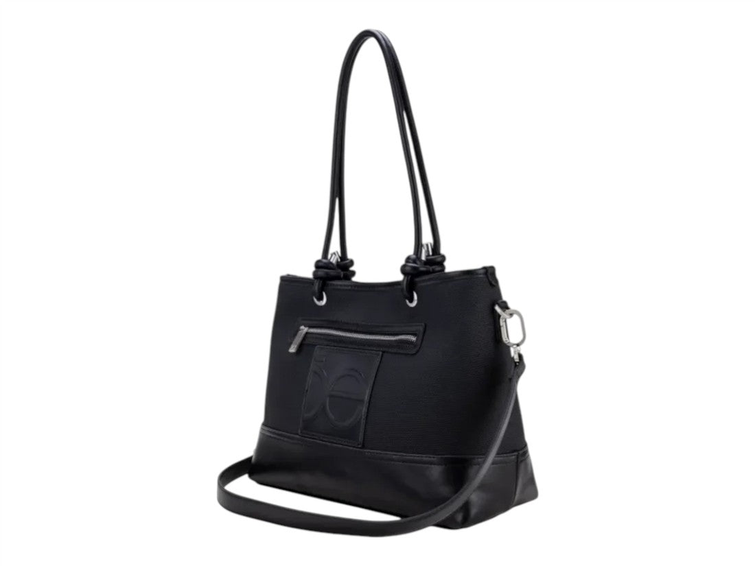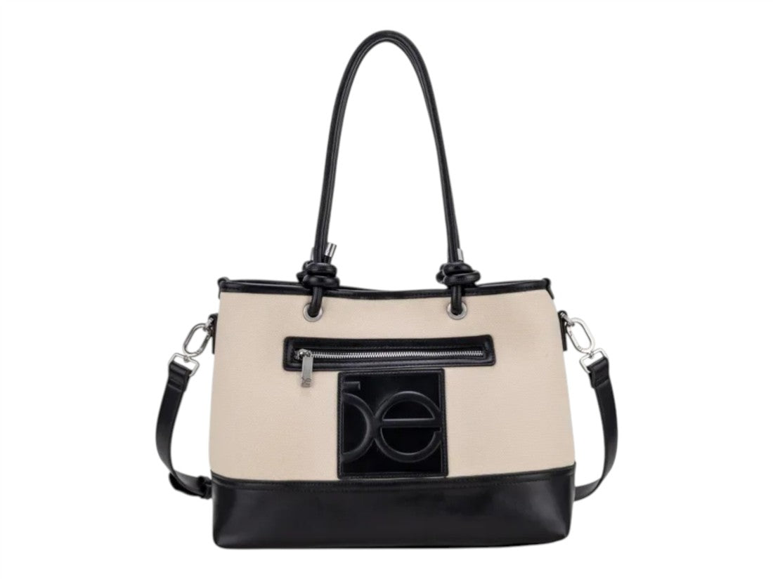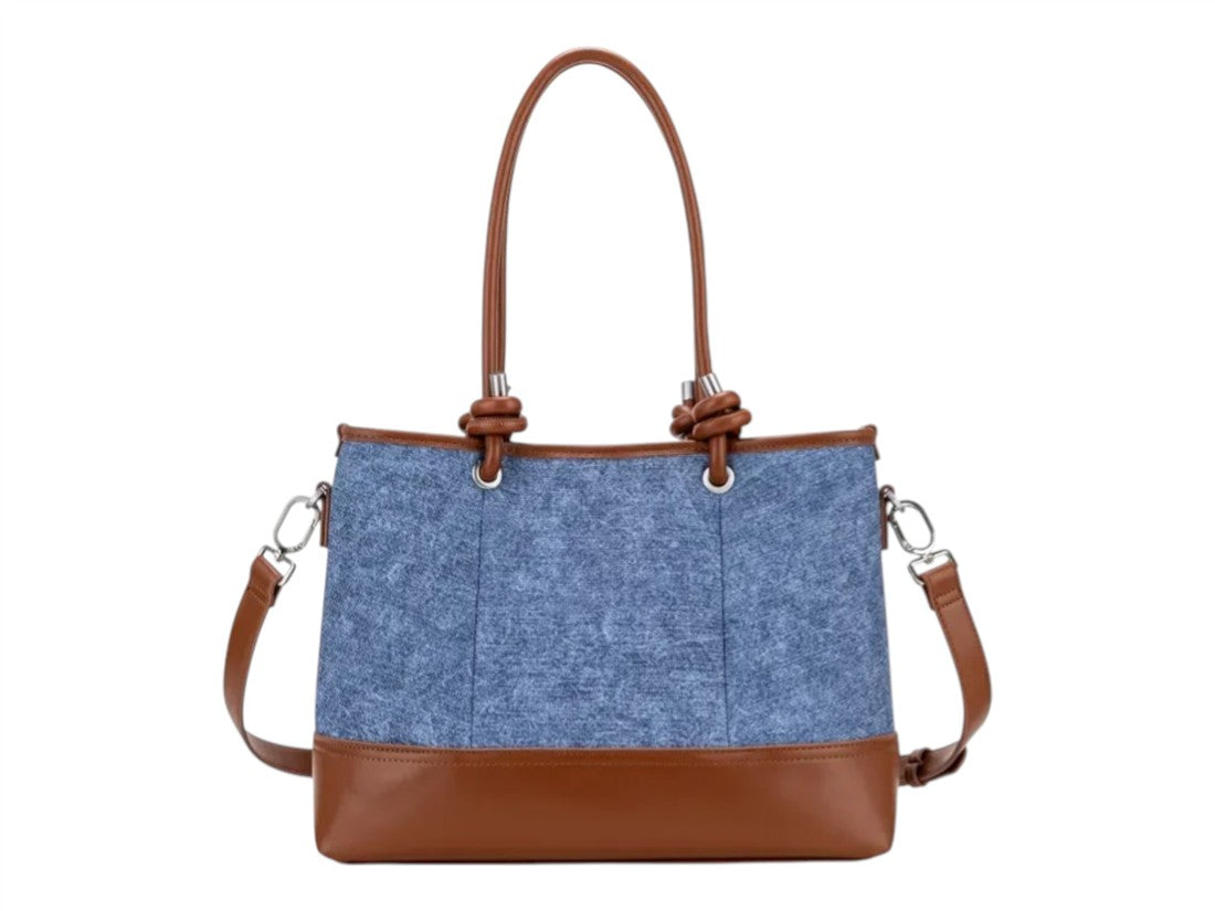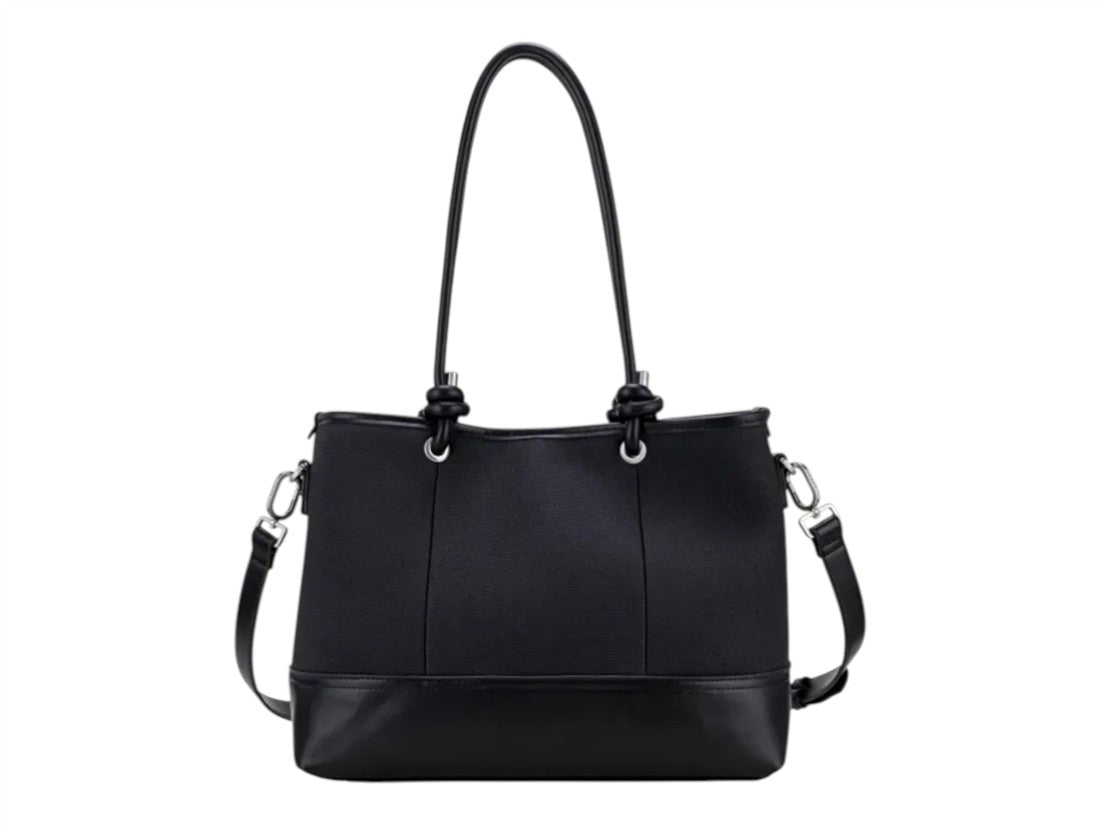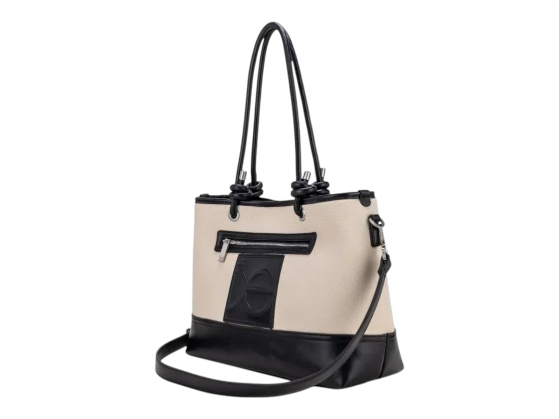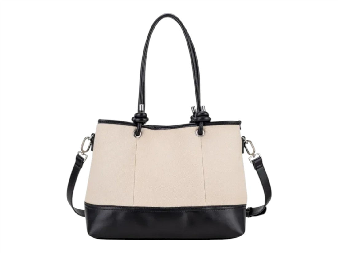 Bolso tipo tote casual con texturas combinadas y asas cortas con detalle de nudo.