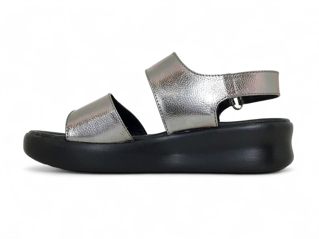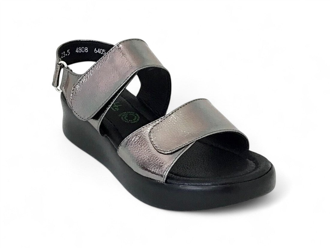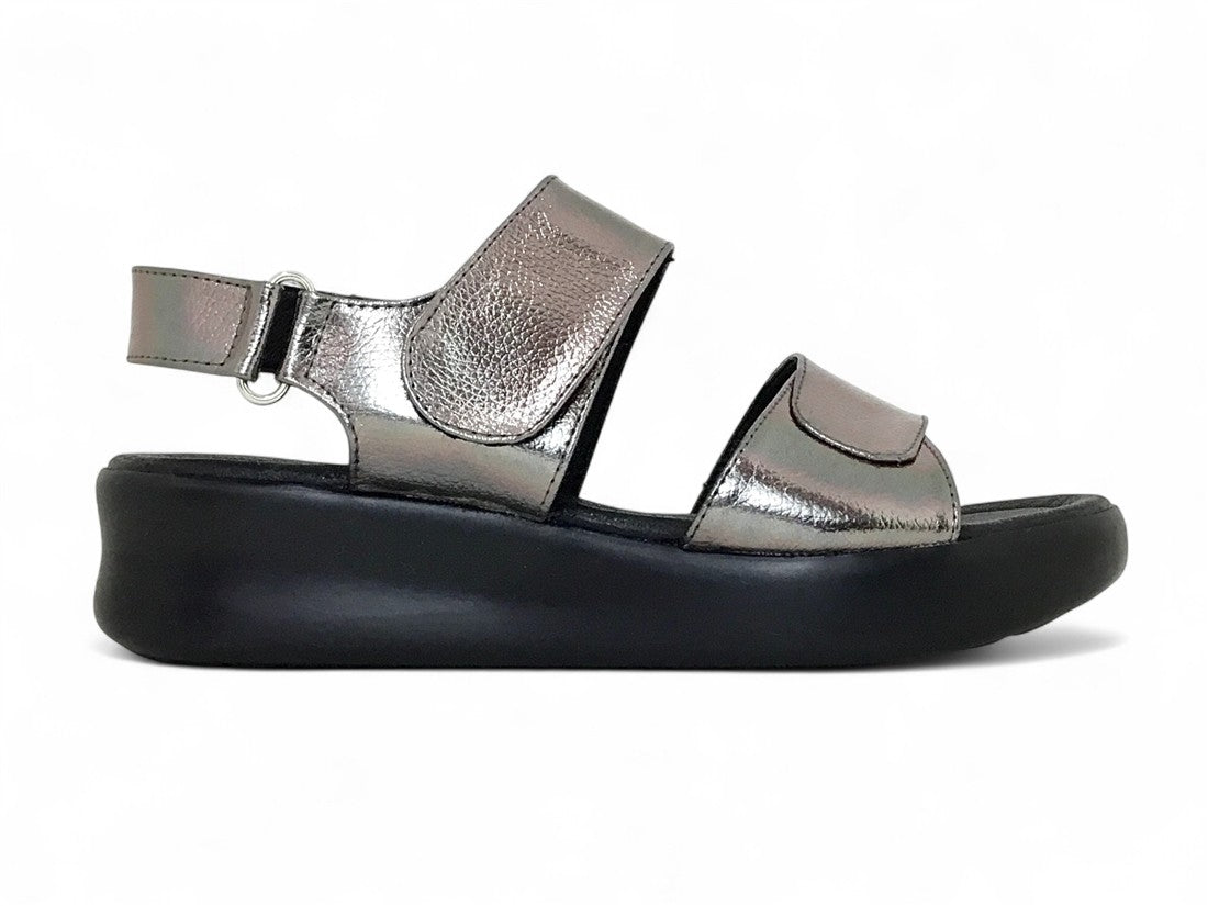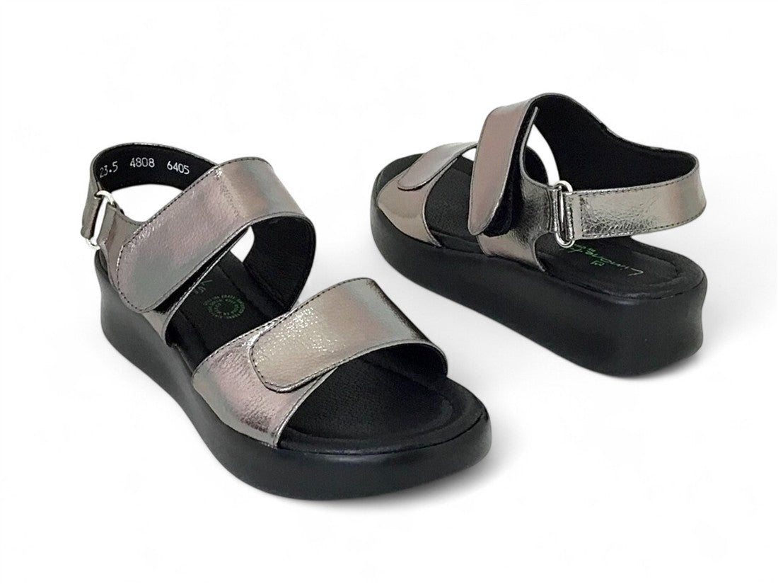 Sandalia casual CLINTON para mujer, diseño metálico con cómoda cuña y cierre de velcro.