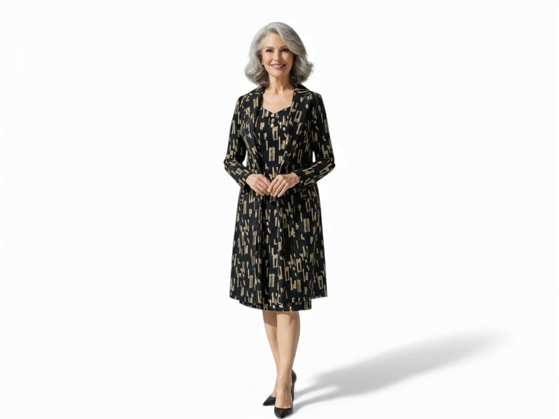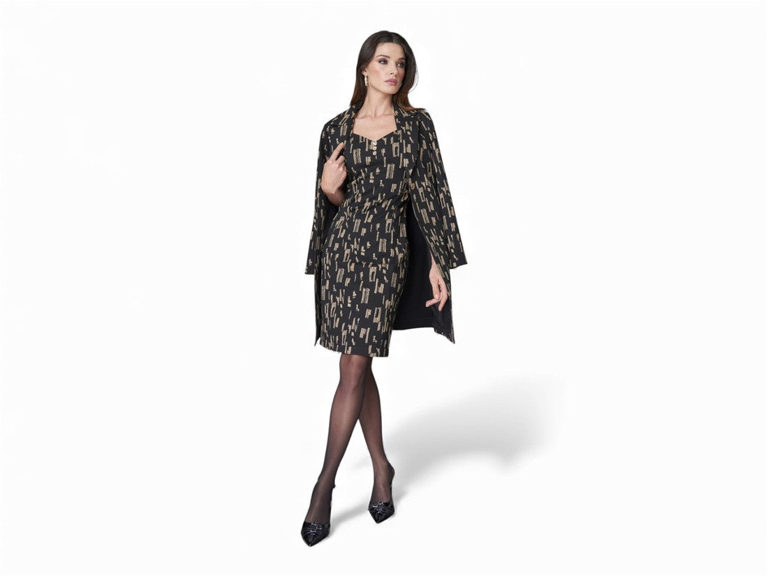 Conjunto casual elegante para dama: traje estampado con blazer de manga larga. Marca ROSYS CHIC.