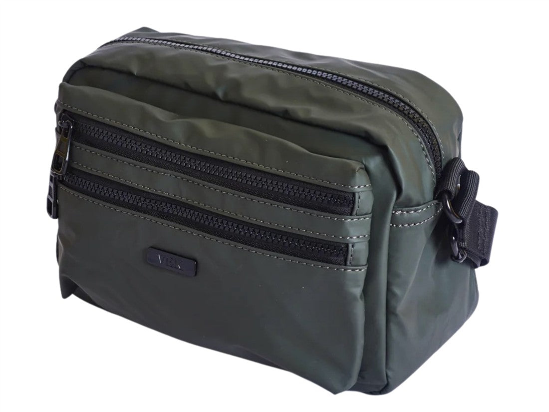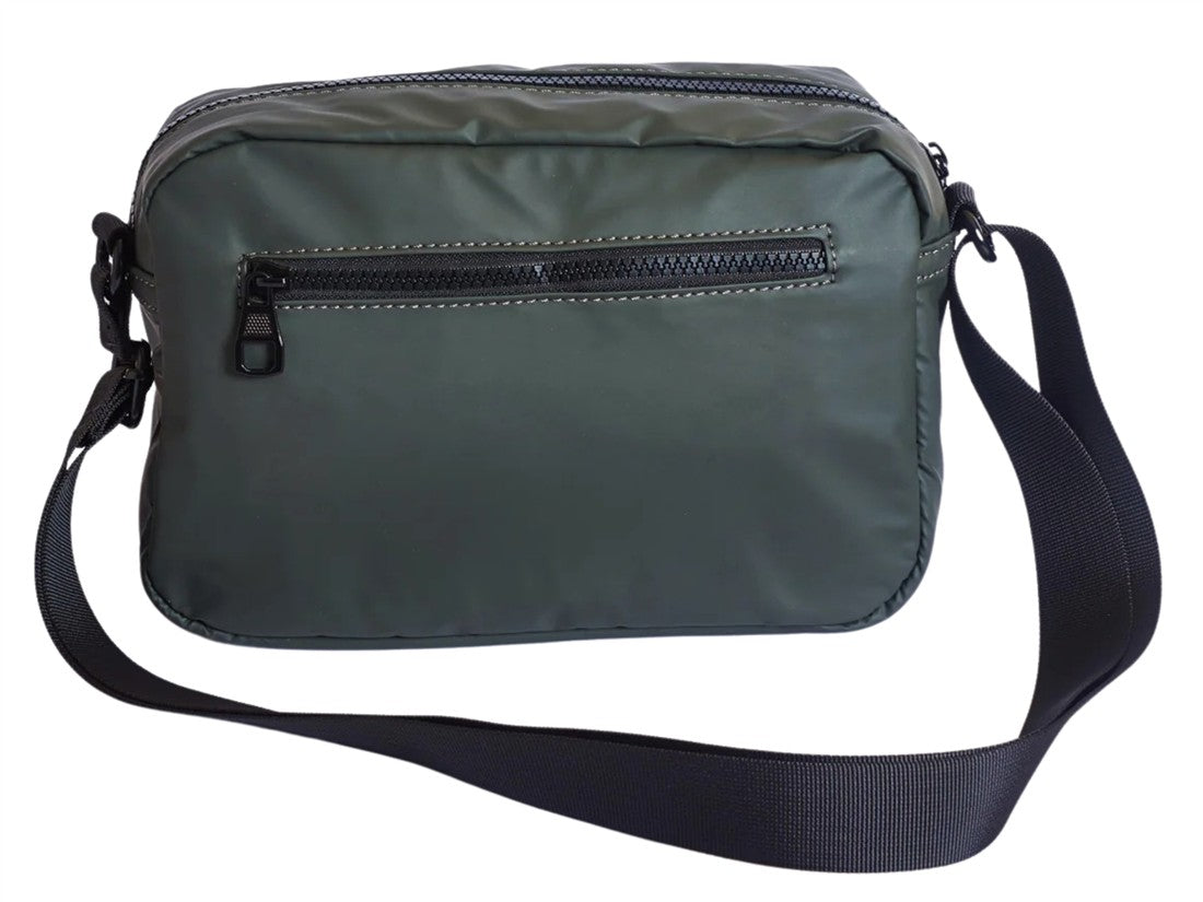 Bolso tipo Crossbody elaborado en poliuretano. Correa, cierres y herraje en color negro. Cuenta con correa ajustable y doble compartimento al frente con cierre y compartimento con cierre en la parte posterior, en su interior tiene cuatro compartimentos para que organices todos tus complementos. Material: Poliuretano Impermeable. Dimensiones: 24X16X12 cm