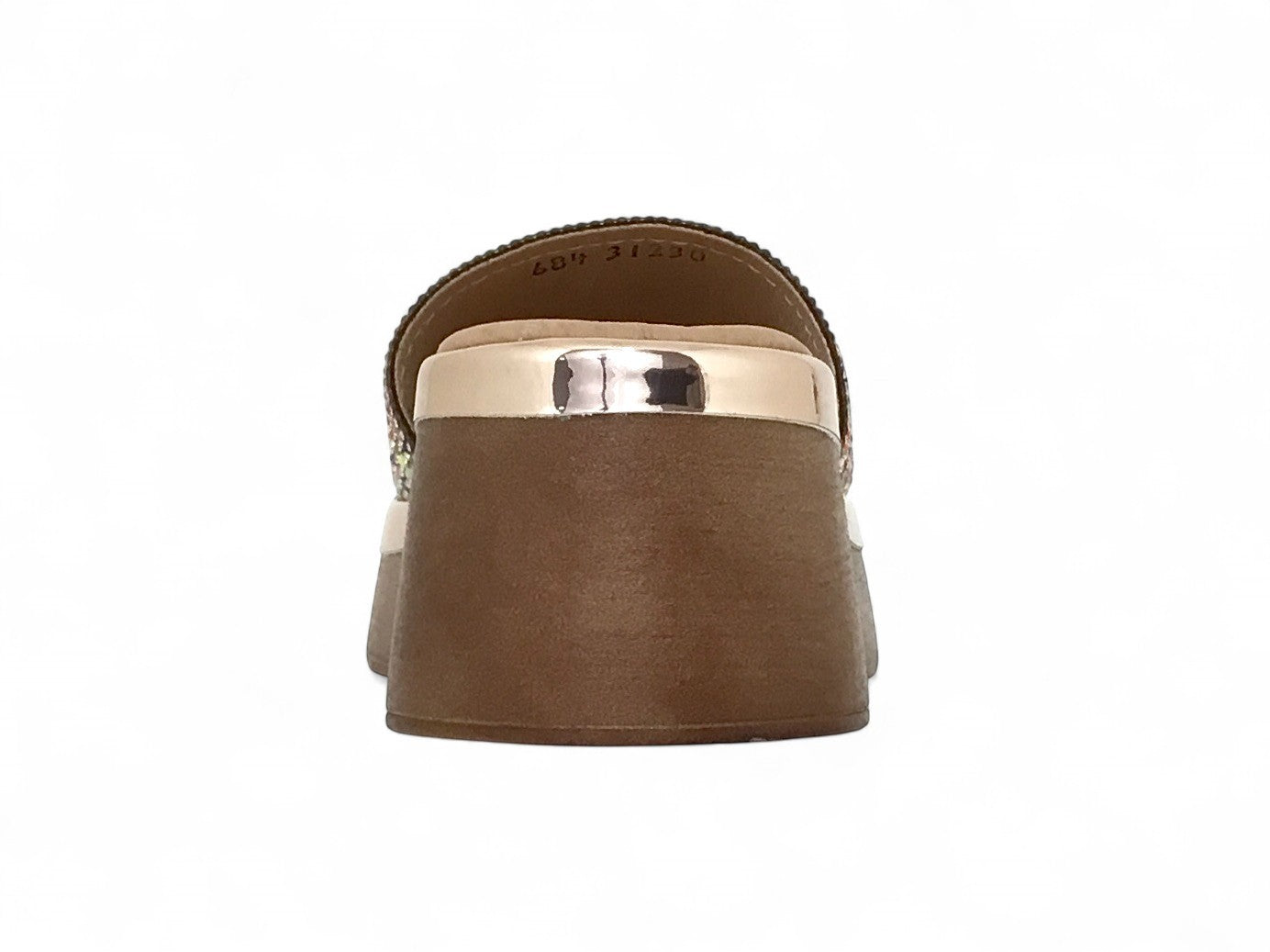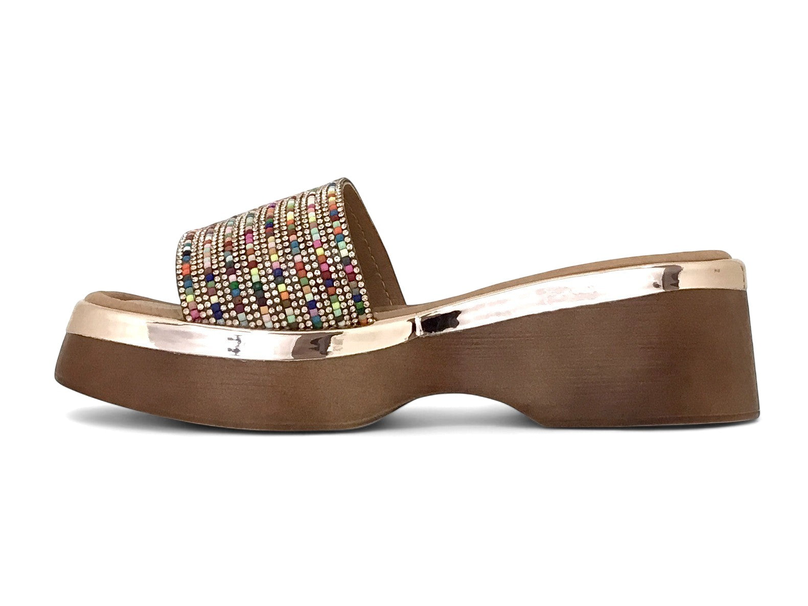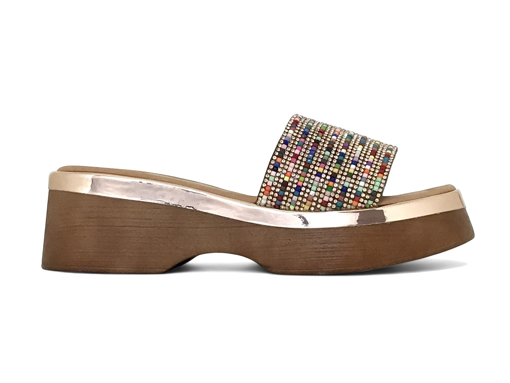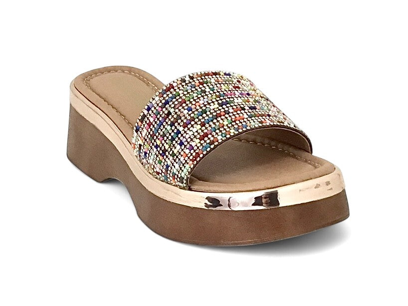Sandalia casual para dama con cuña maderada y detalles de piedras coloridas. Marca: Diana Denisse.