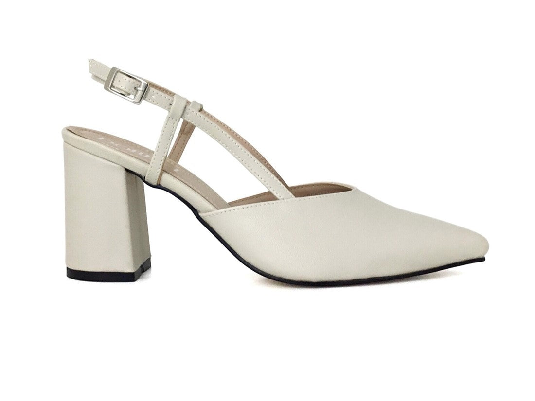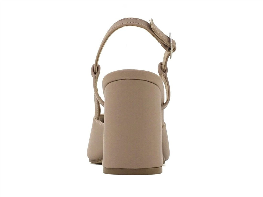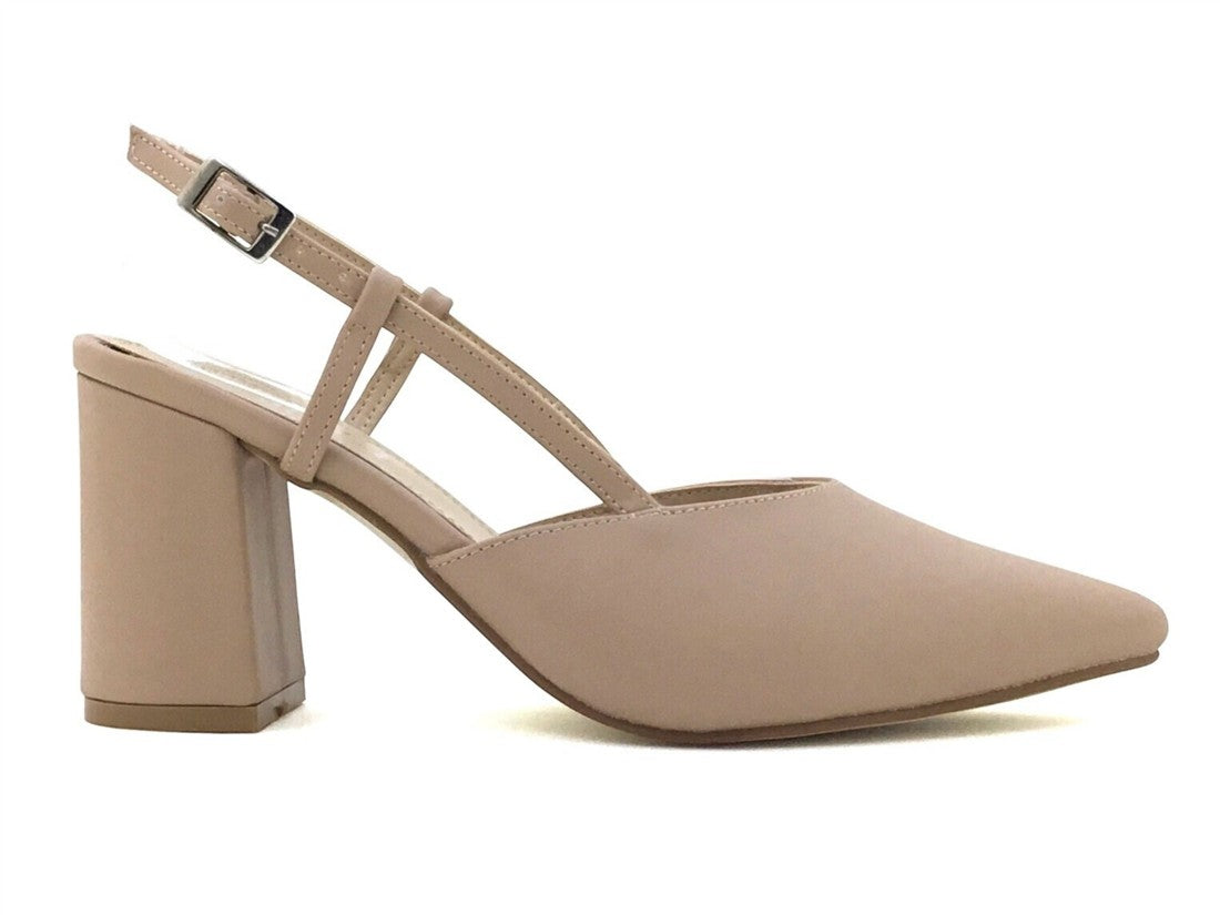 SANDALIA DE TACON DESTALONADA CON PUNTERA TRIANGULAR Y AJUSTE DE CINCHO CON HEBILLA EN TALON