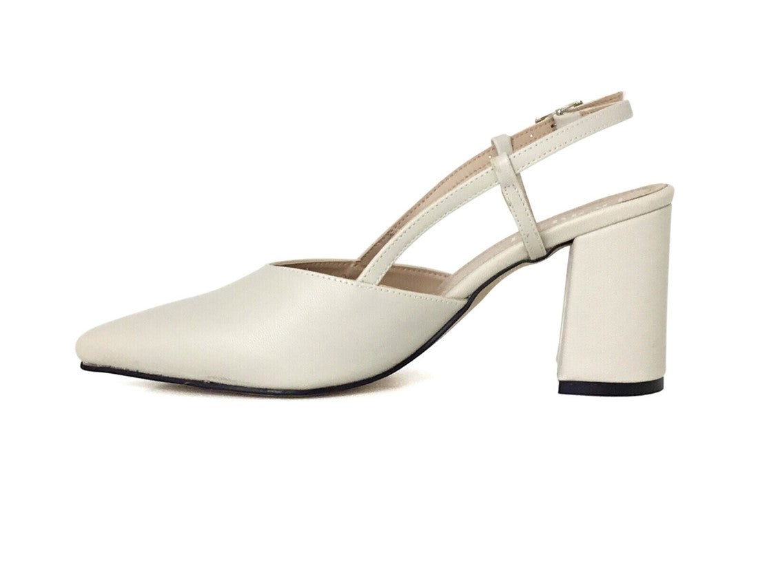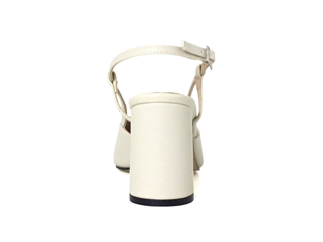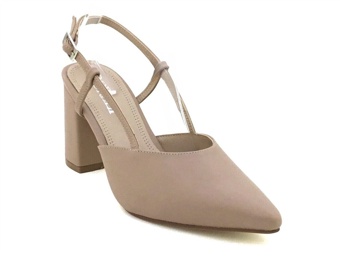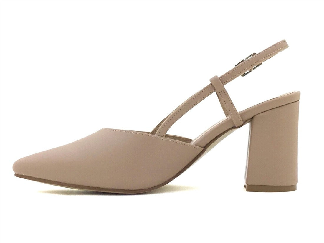 SANDALIA DE TACON DESTALONADA CON PUNTERA TRIANGULAR Y AJUSTE DE CINCHO CON HEBILLA EN TALON