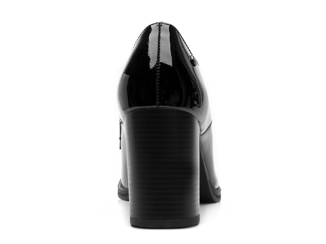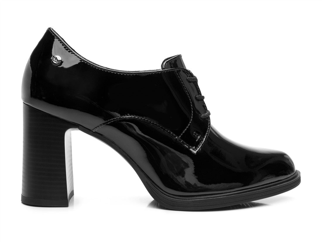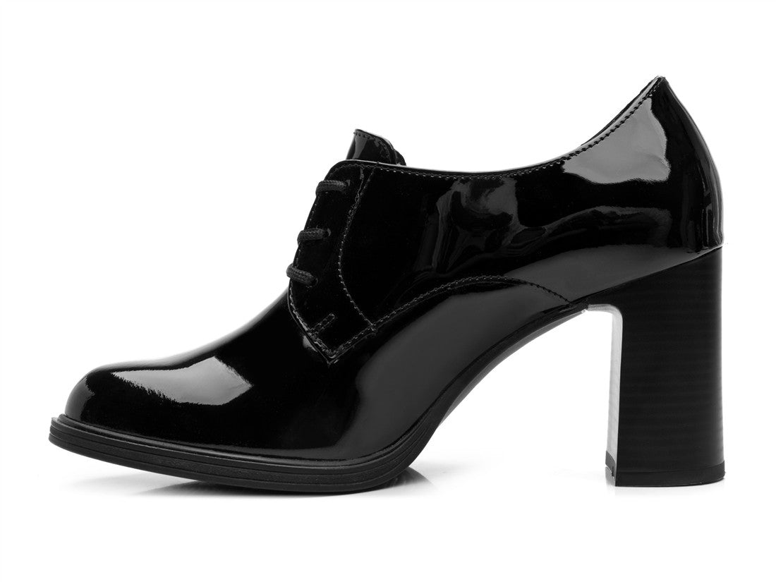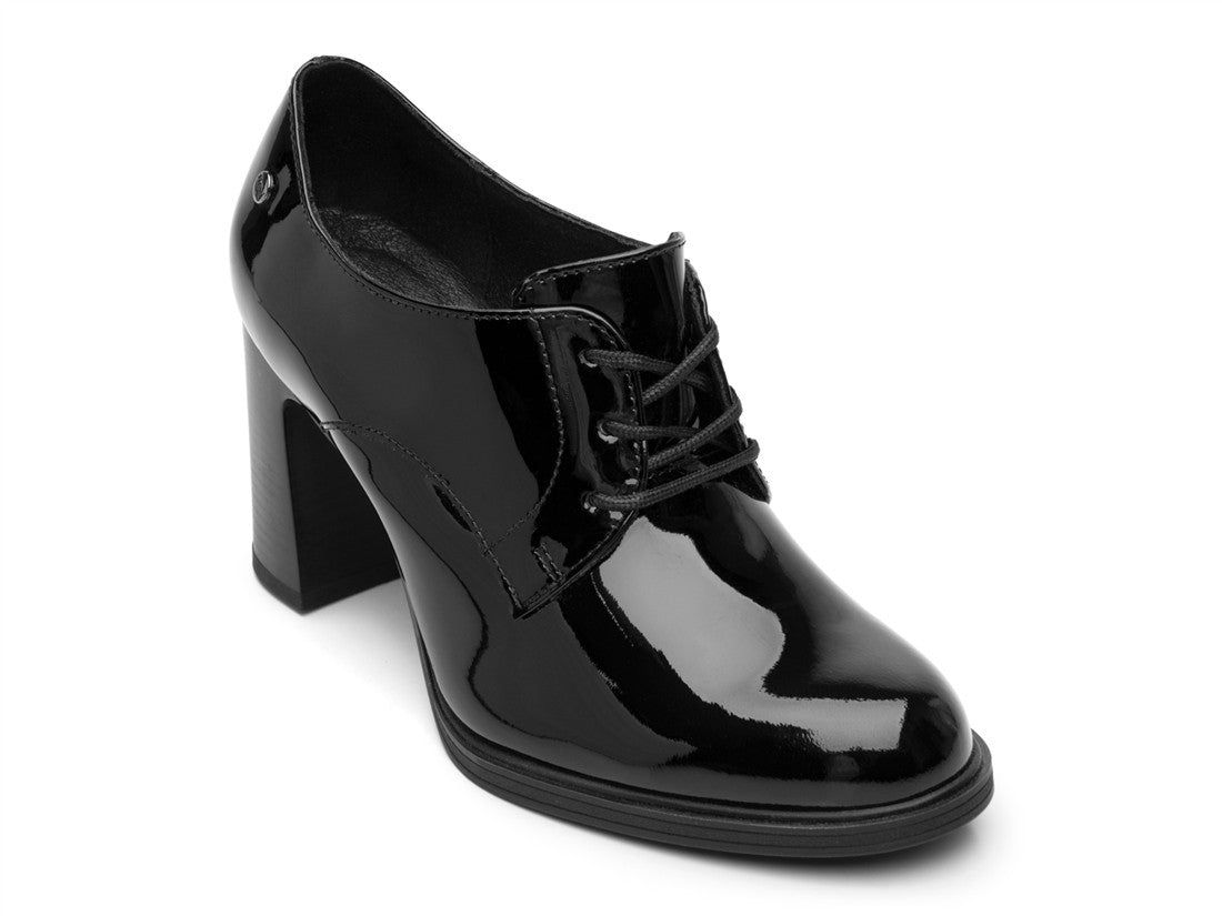 ZAPATO TACON ESTILO BOTIN AJUSTE CON CORDONES DISEÑO CHAROL LISO SUELA ABS