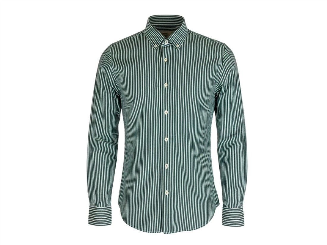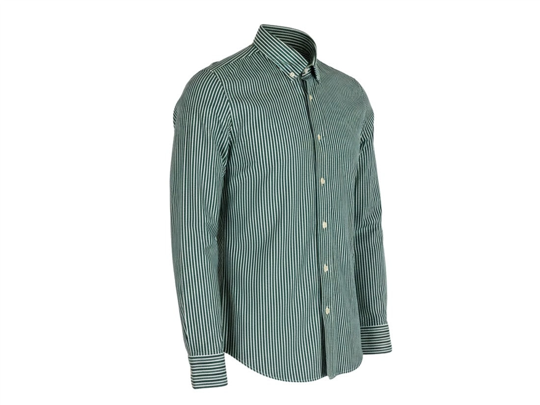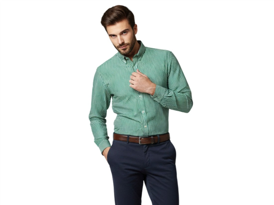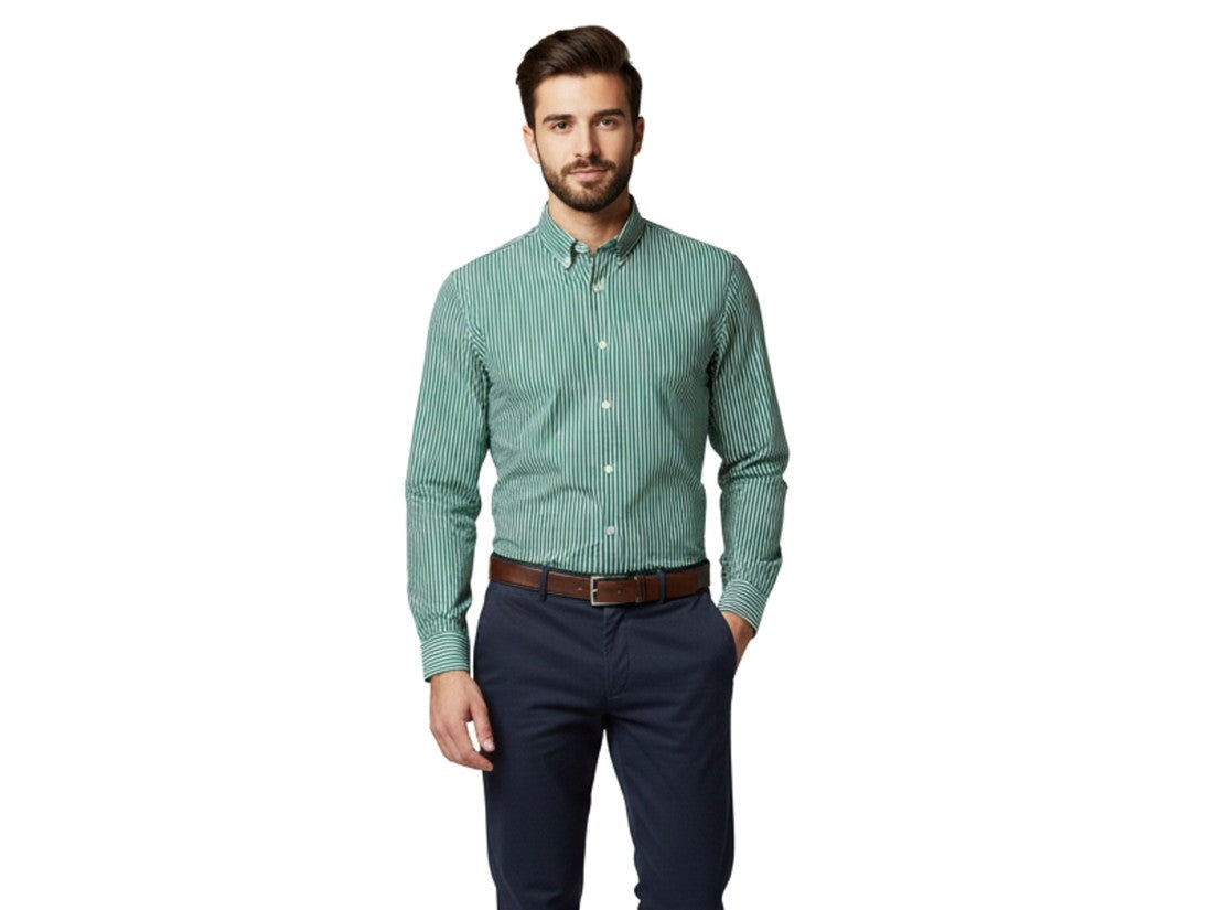 Explora la elegancia casual con la camisa de rayas manga larga de ALBERTO OLGUIN.