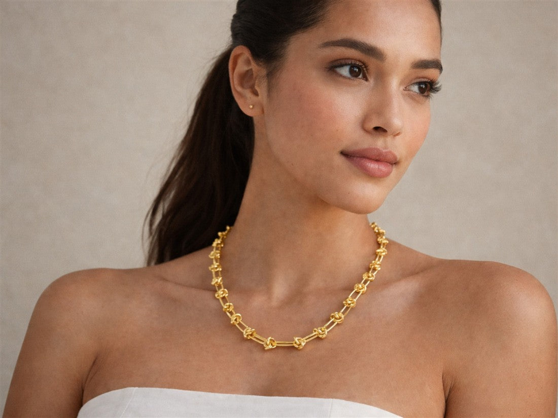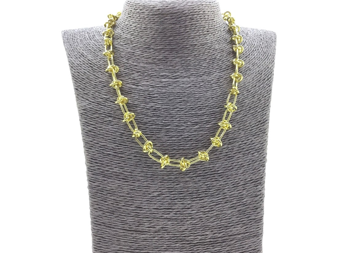 Descubre el collar Aria de ROELA, un accesorio casual para la mujer moderna. Este elegante collar, elaborado en chapa con un sofisticado baño de oro, presenta eslabones alargados y rectilíneos. Cada eslabón está unido por delicados nudos dorados, creando un diseño con discretos detalles en relieve que aportan volumen y carácter. Es la elección perfecta para adicionar un toque de refinamiento a cualquier atuendo.
