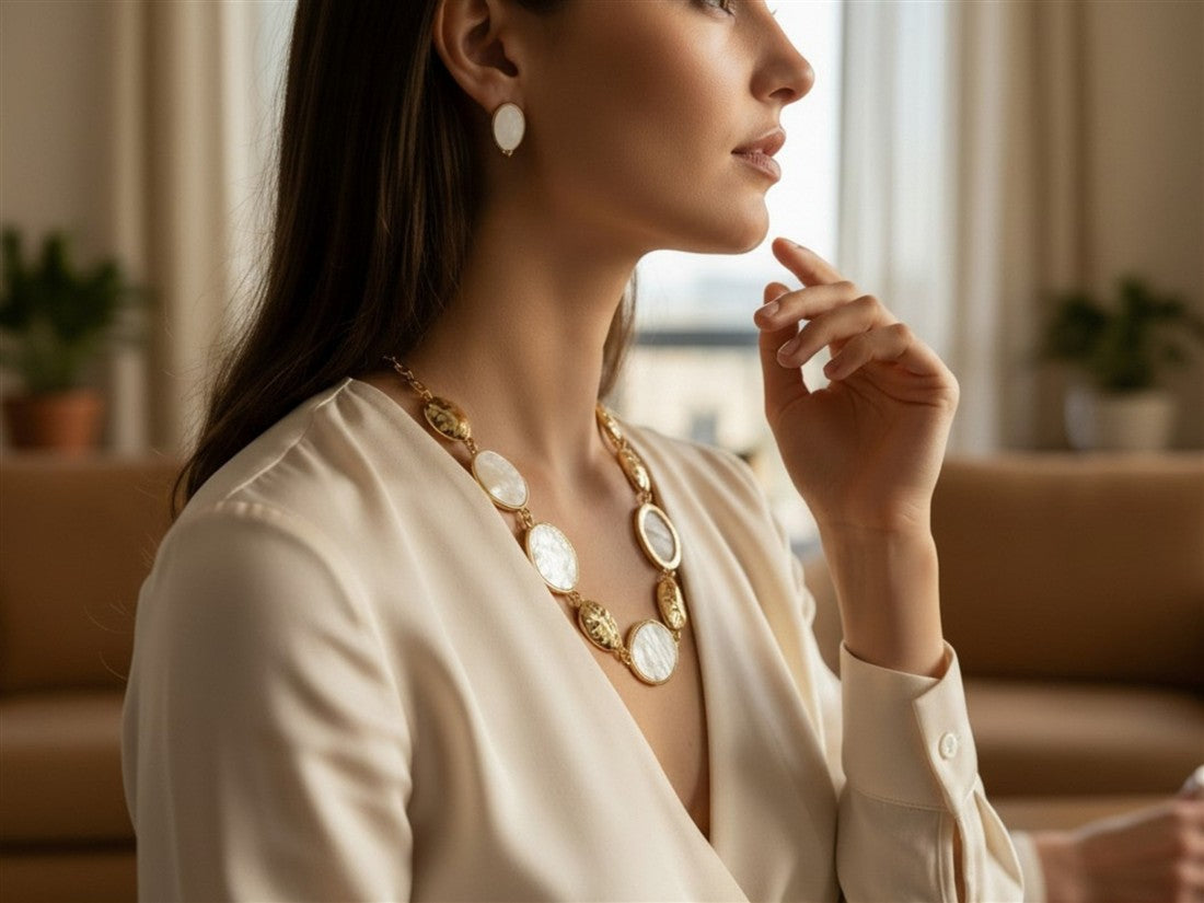Descubre la elegancia casual con el juego de collar y aretes MAGOLA. Este sofisticado conjunto combina pedrería y chapa, perfecto para realzar tu estilo diario. Ideal para la mujer moderna que busca un toque de distinción en sus accesorios. Perfecto para cualquier ocasión.