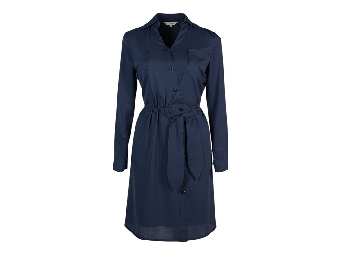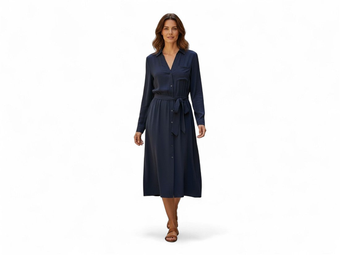 Vestido casual de manga larga con botones y cinta en la cintura, ideal para mujeres modernas.