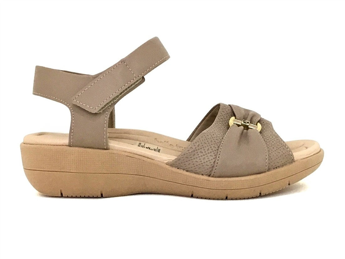 SANDALIA CUÑA AJUSTE CON CINTA DE VELCRO DETALLE DORADO AL FRENTE Y SUELA CON TEXTURIZADA