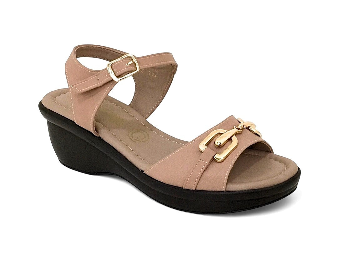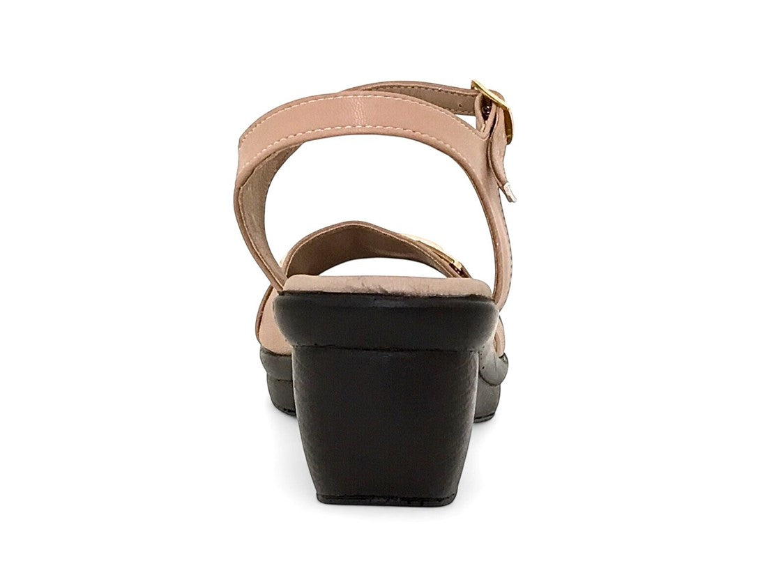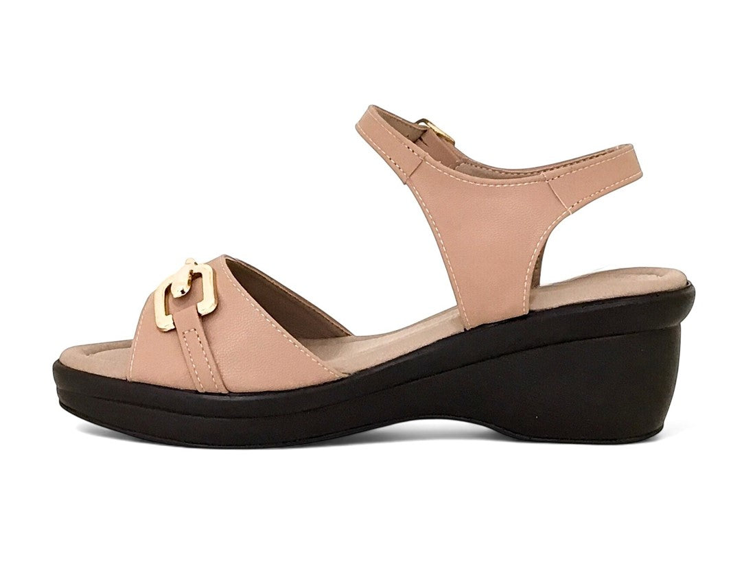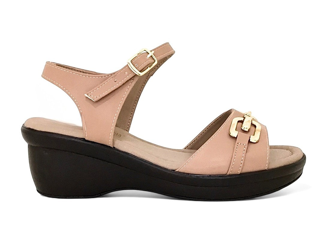 Sandalia casual para dama con cuña, cincho ajustable y elegante herraje decorativo.