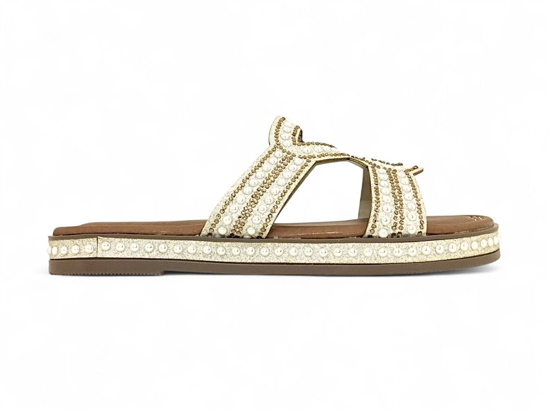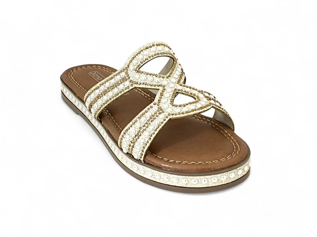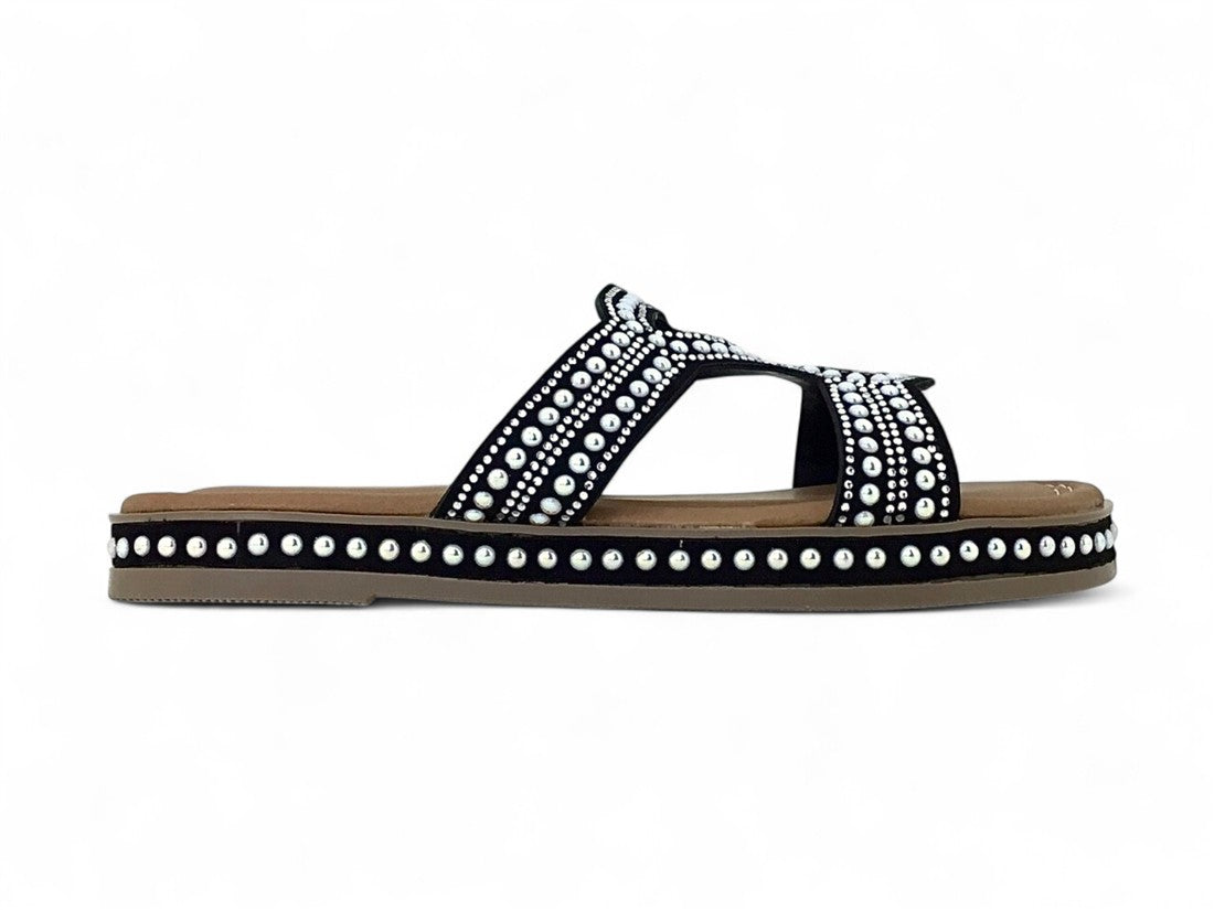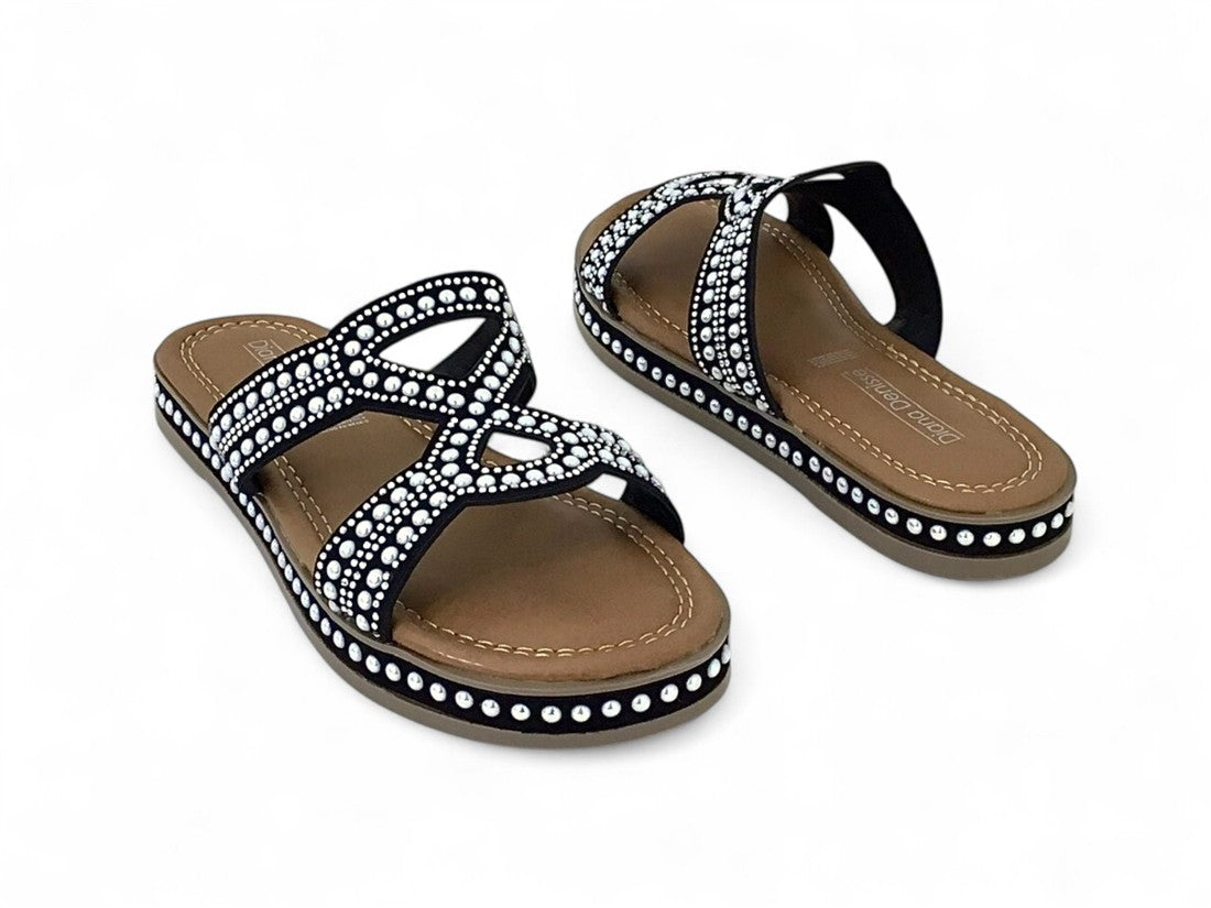 SANDALIA PISO DAMA DESTALONADA DISEÑO CON PEDRERIA BRILLANTE DE SUELA ANTIDESLIZANTE
