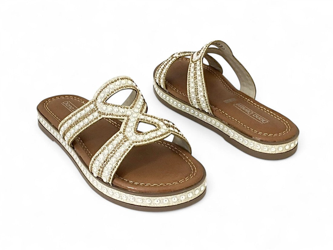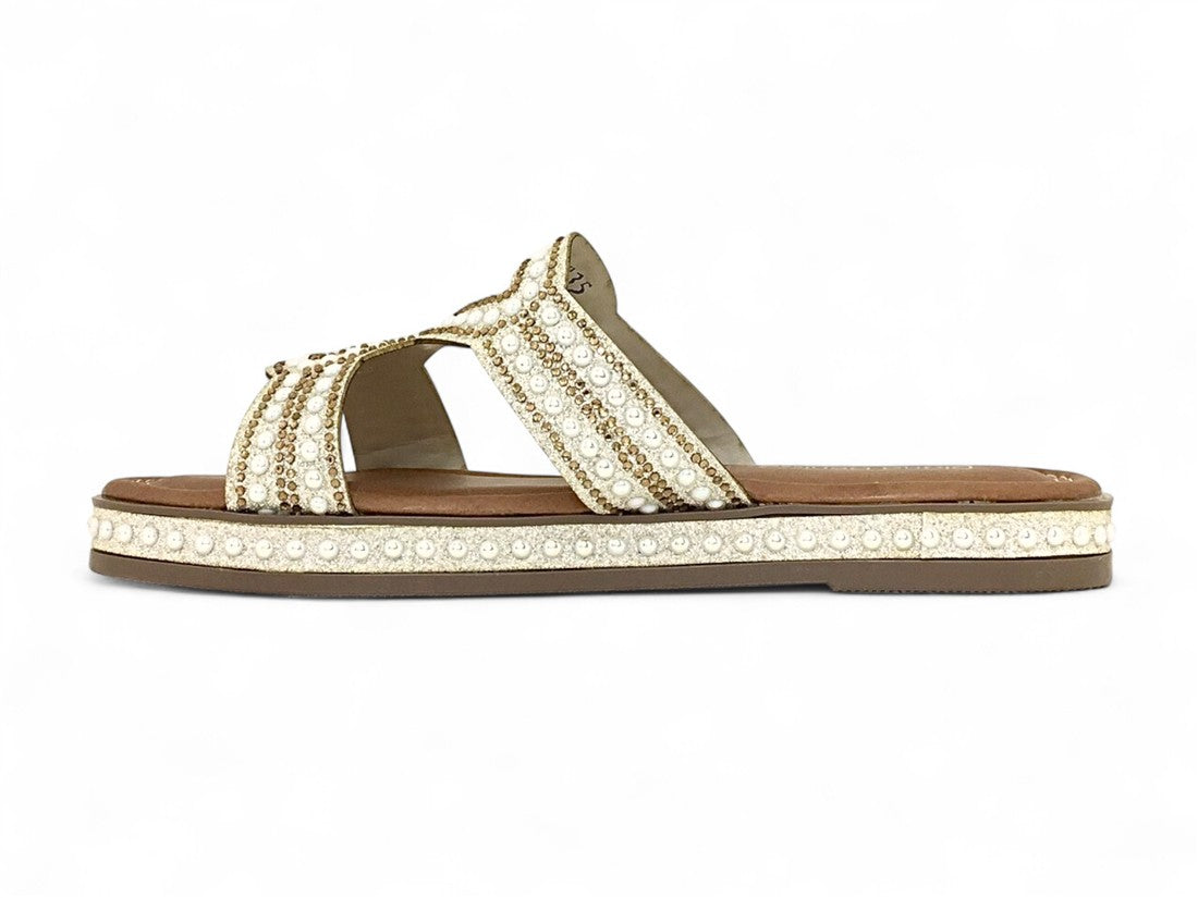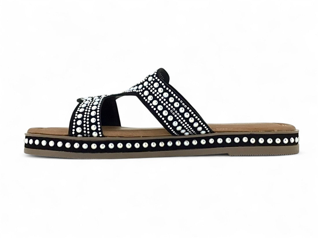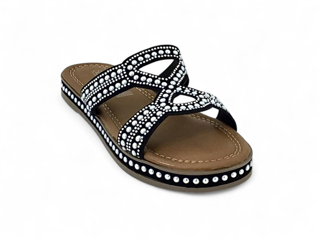 SANDALIA PISO DAMA DESTALONADA DISEÑO CON PEDRERIA BRILLANTE DE SUELA ANTIDESLIZANTE