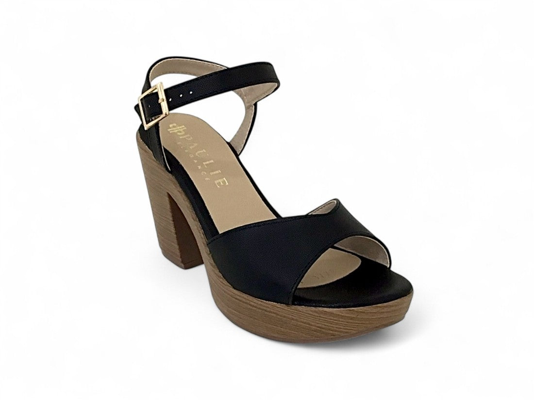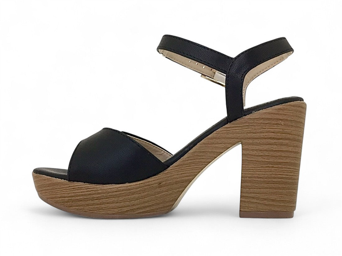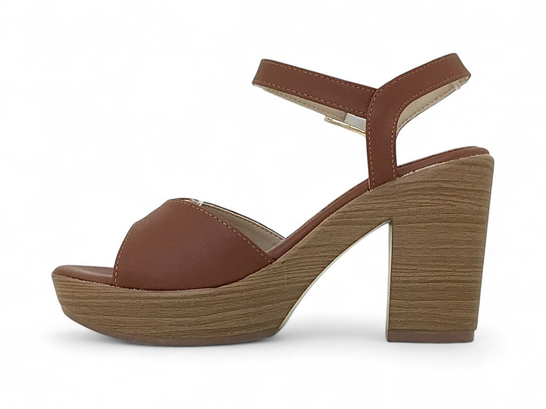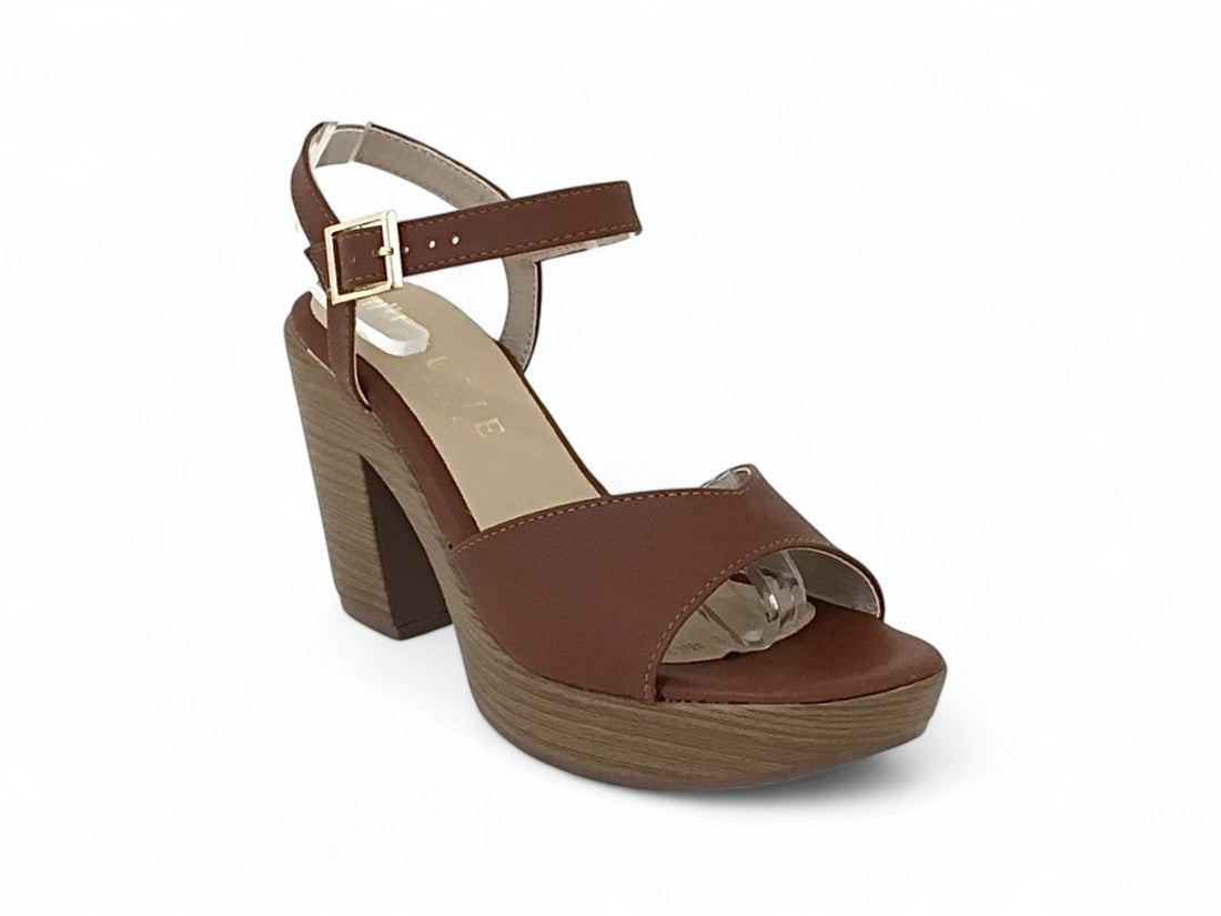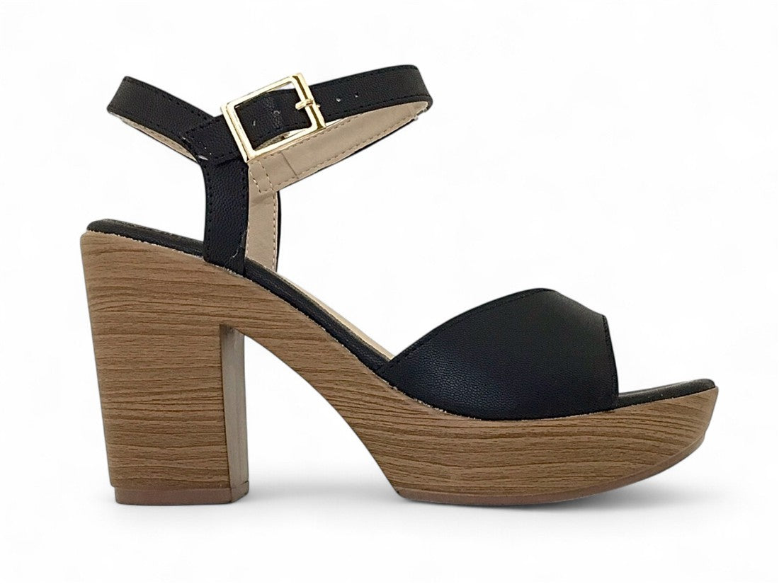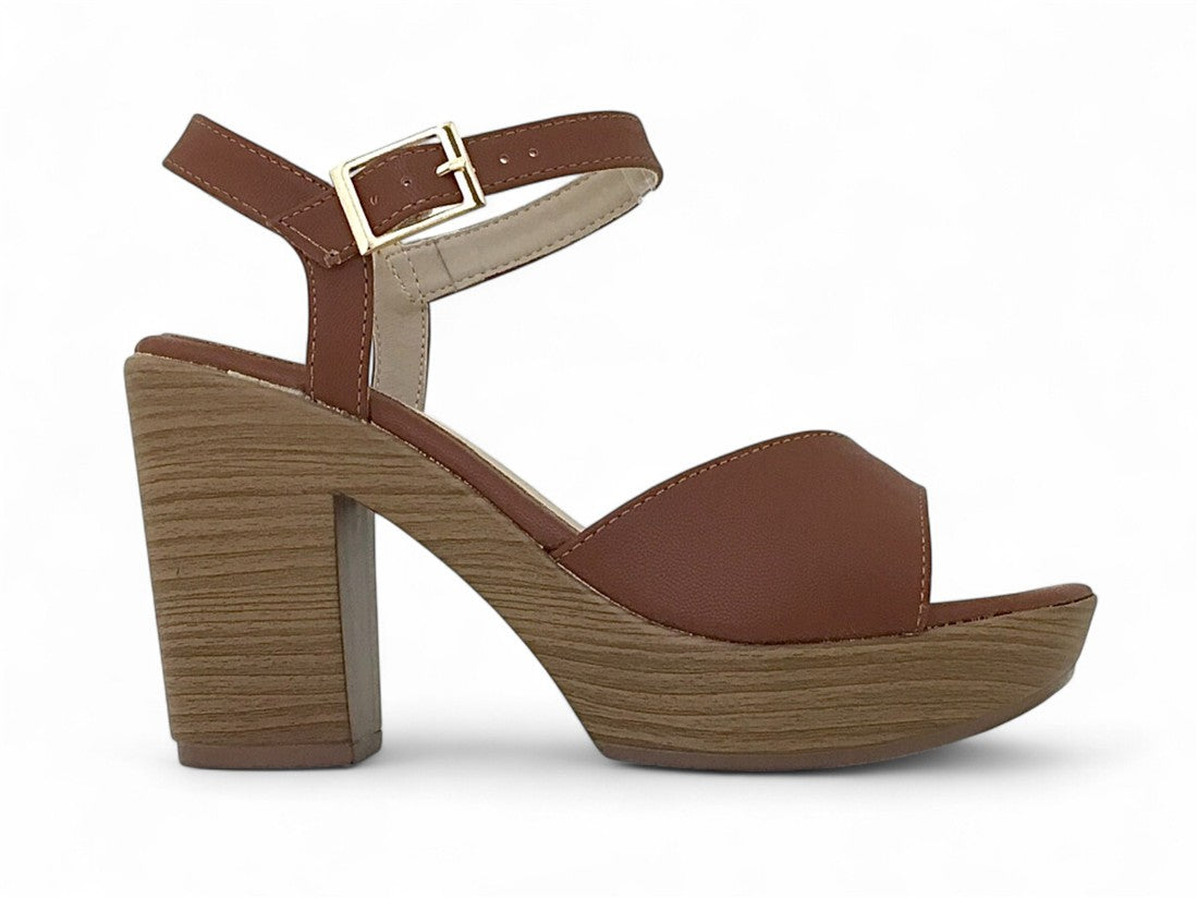 SANDALIA PLATAFORMA CON TACON AMADERADO AJUSTE DE CORREA CON HEBILLA METALICA EN TALON