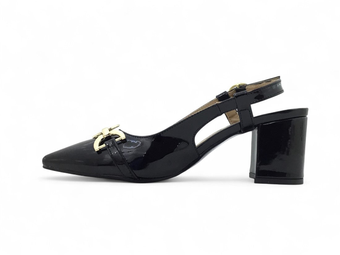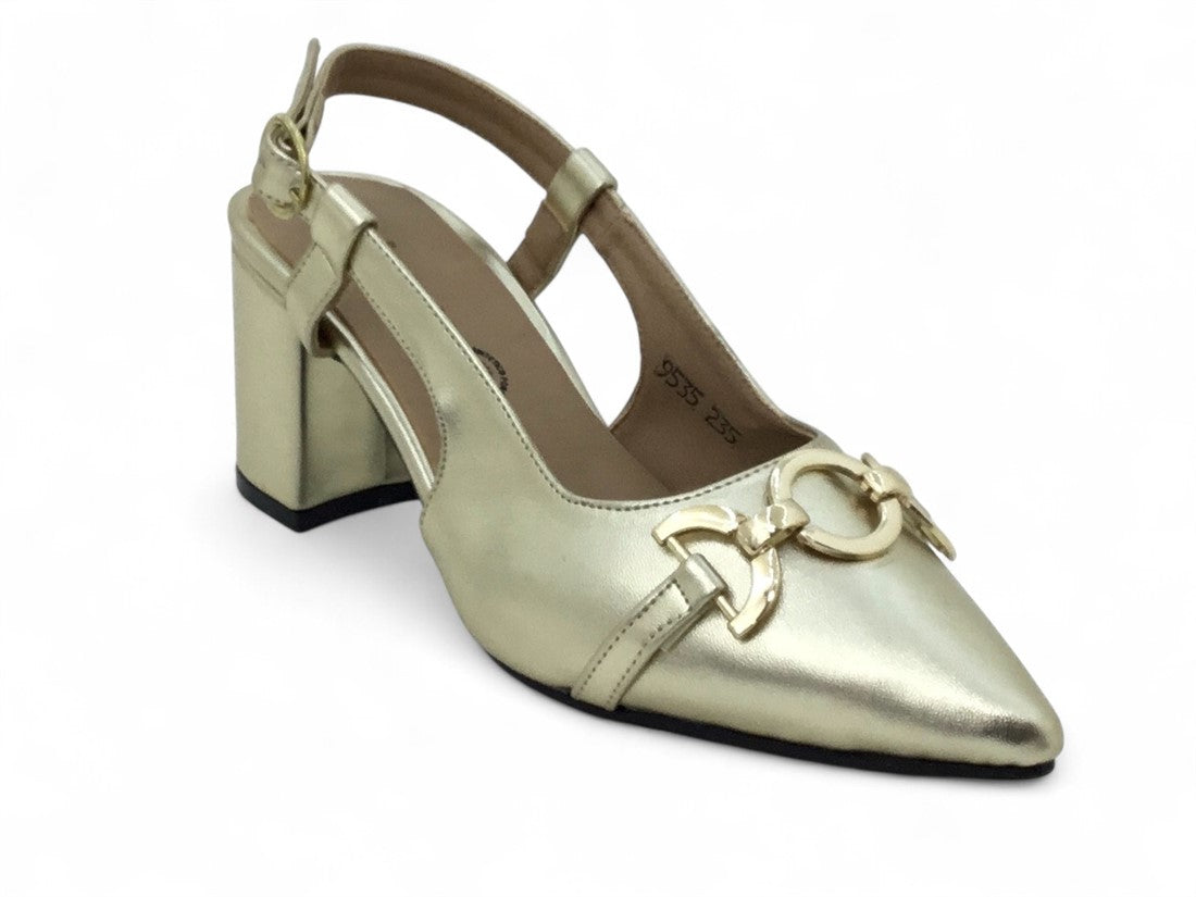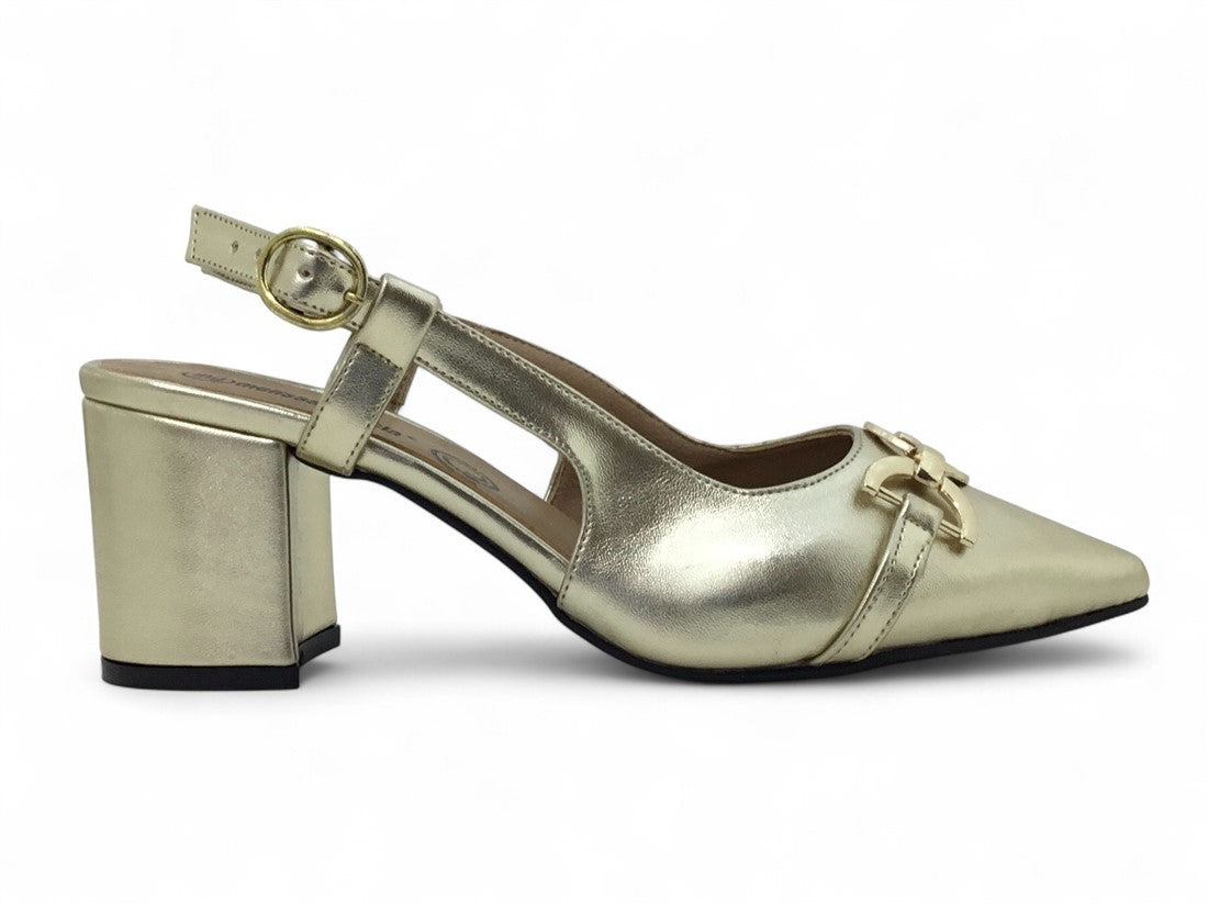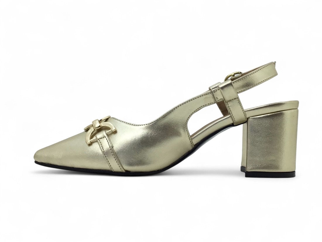 SANDALIA TACON BAJO DE CORREA CON HEBILLA REDONDA DE PUNTERA TRIANGULAR Y DETALLE METALICO