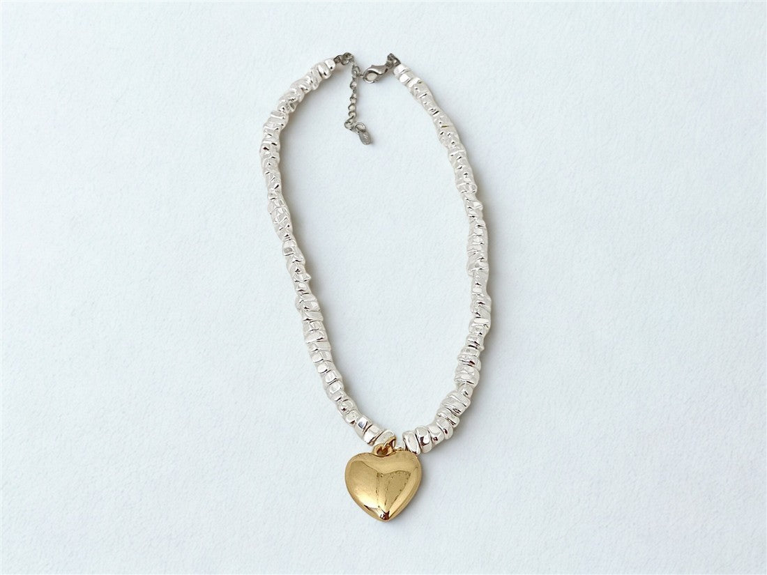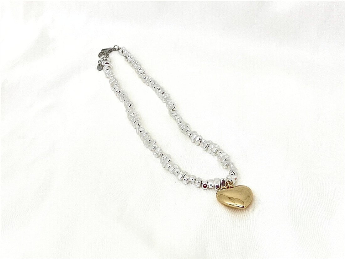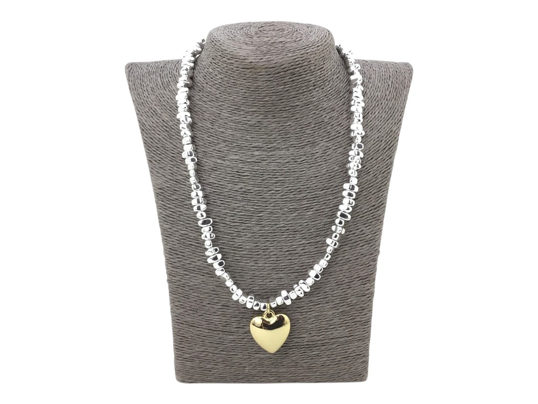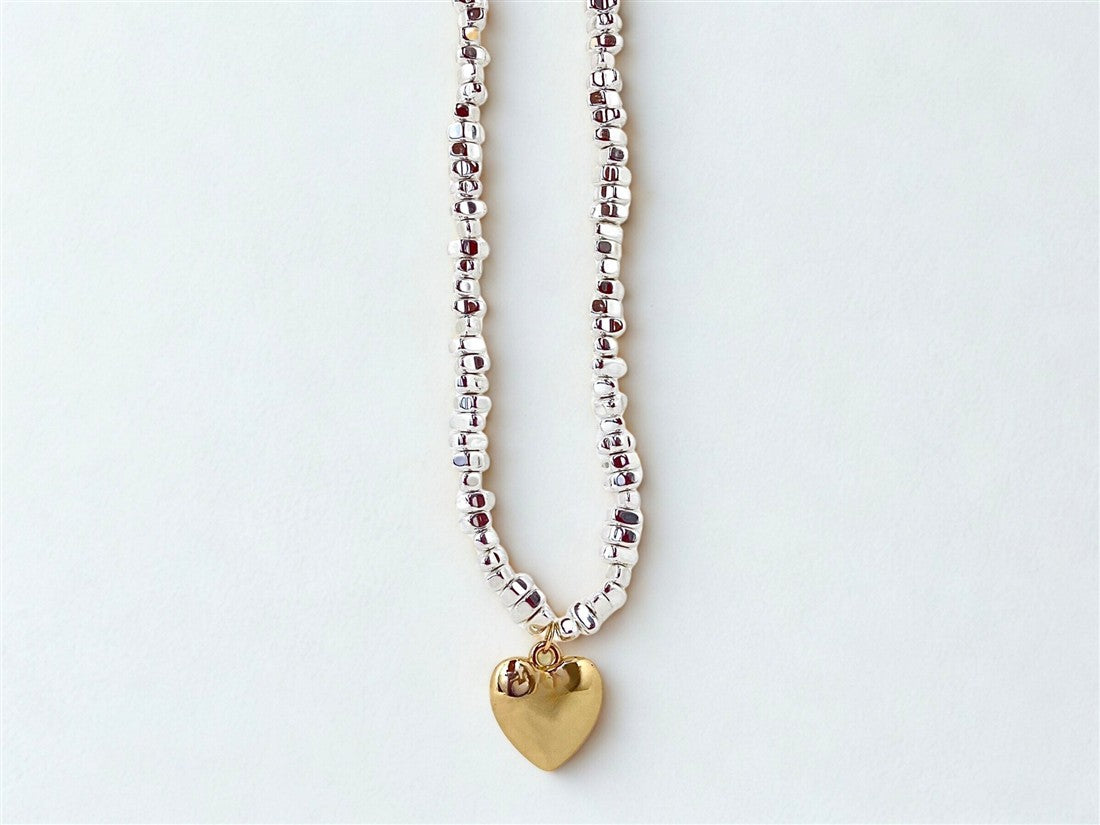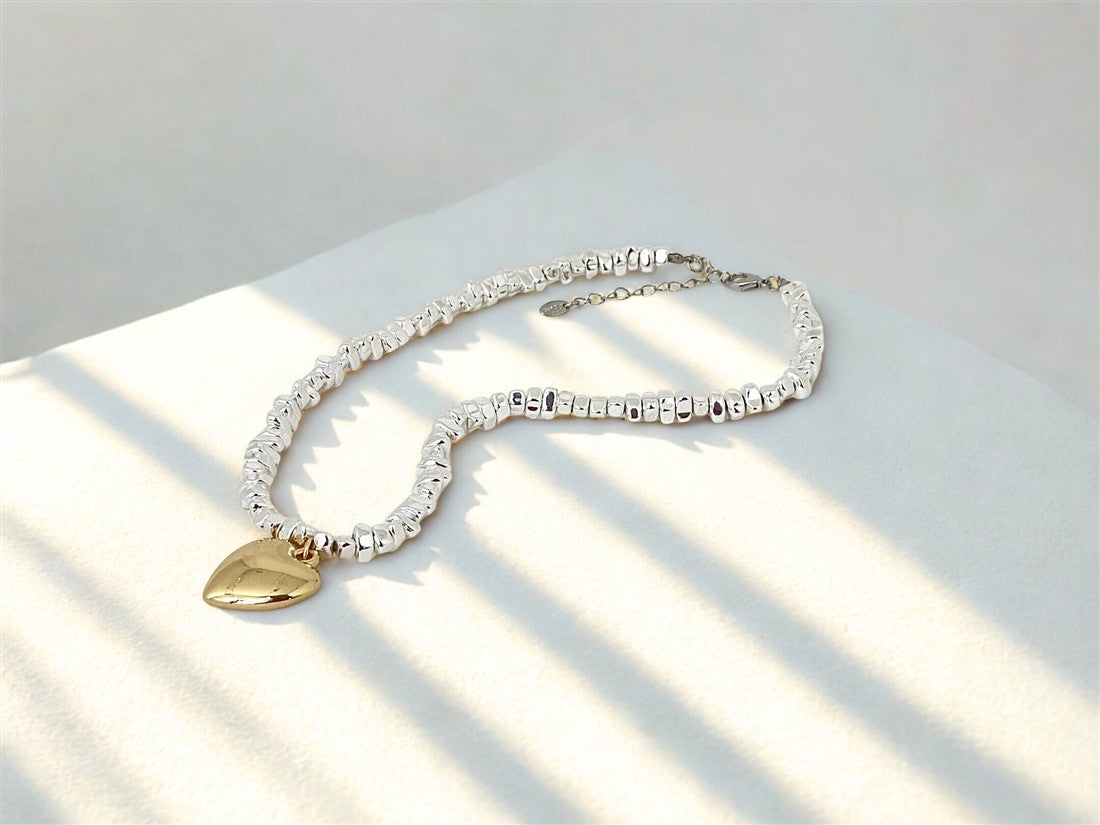 Collar Muskoka casual de cuentas irregulares en plata y dije dorado de corazón.
