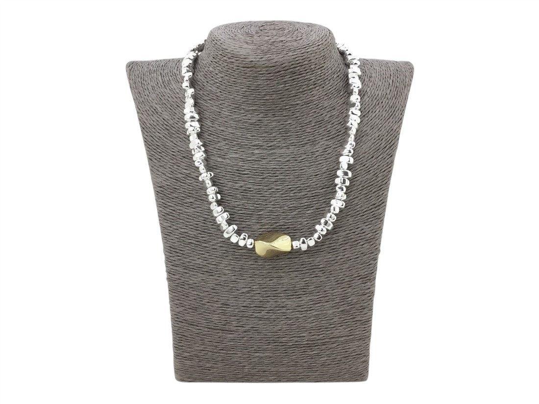 Descubre elegancia y simplicidad con el collar HCC015 de la línea ACCESORIOS DAMA de MUSKOKA. Diseñado para la mujer moderna, este collar estilo gargantilla combina cuentas plateadas con un llamativo dije dorado amorfo como punto focal. Fabricado en resistente acero, es el complemento perfecto para un look casual con un toque moderno y actual. Ideal para elevar cualquier conjunto diario con sofisticación y estilo.