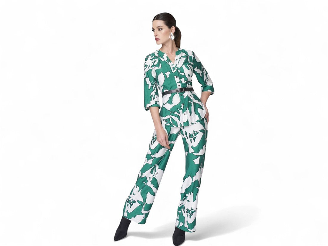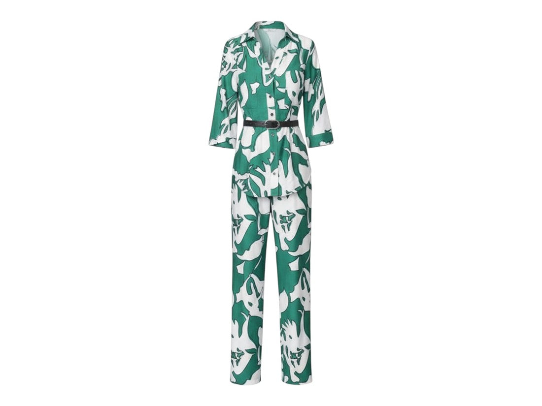 Coordinado casual ROSYS CHIC: blusa y pantalón estampado con cinto para dama.