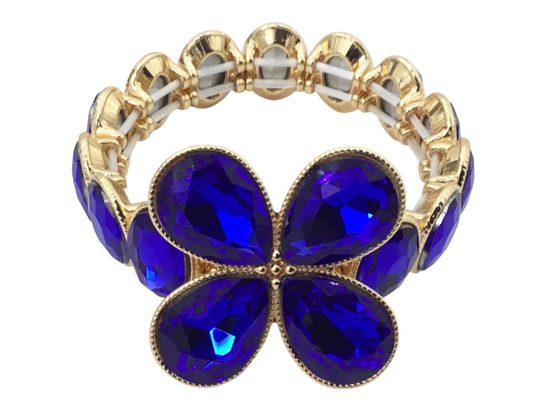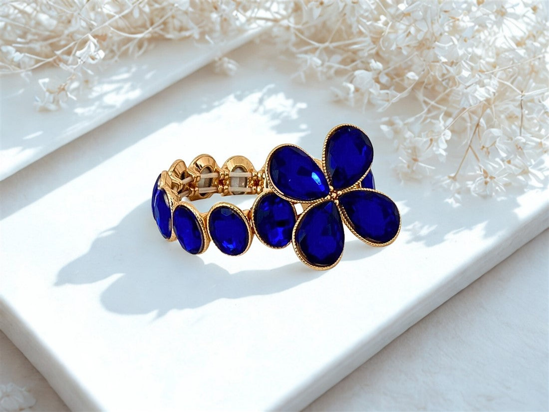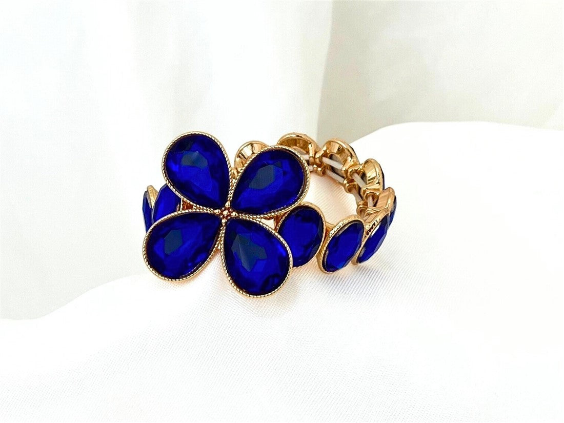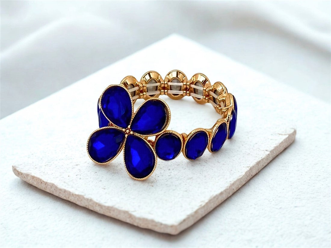 PULSERA ESTILO BRAZALETE ELASTICO CON PIEDRAS REDONDAS BRILLANTES Y DETALLE DE FLOR