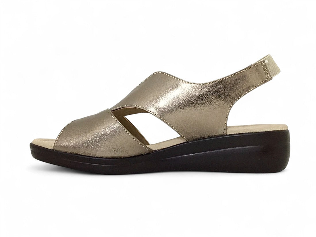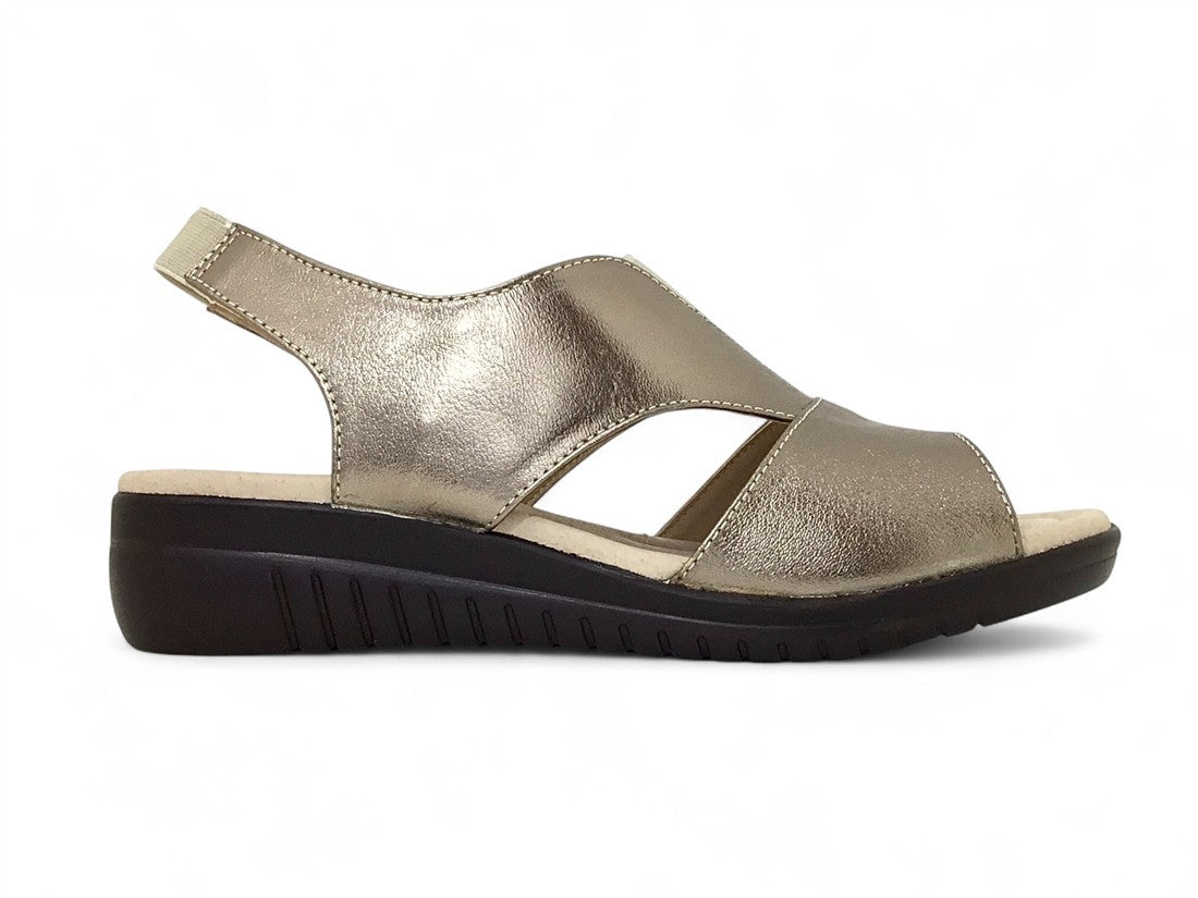 SANDALIA CUÑA ELASTICO EN TALON Y EMPEINE DE DISEÑO METALICO Y SUELA ANTIDESLIZANTE