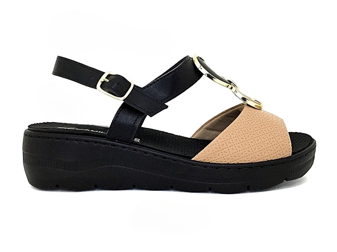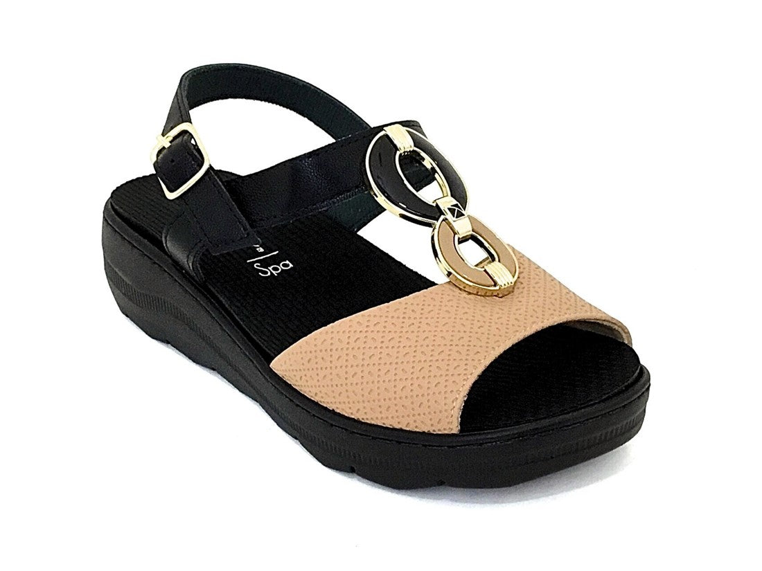 SANDALIA CUÑA AJUSTE DE CINCHO CON HEBILLA DIEÑO CON DETALLE METALICO Y PLANTILLA MASAJEADORA