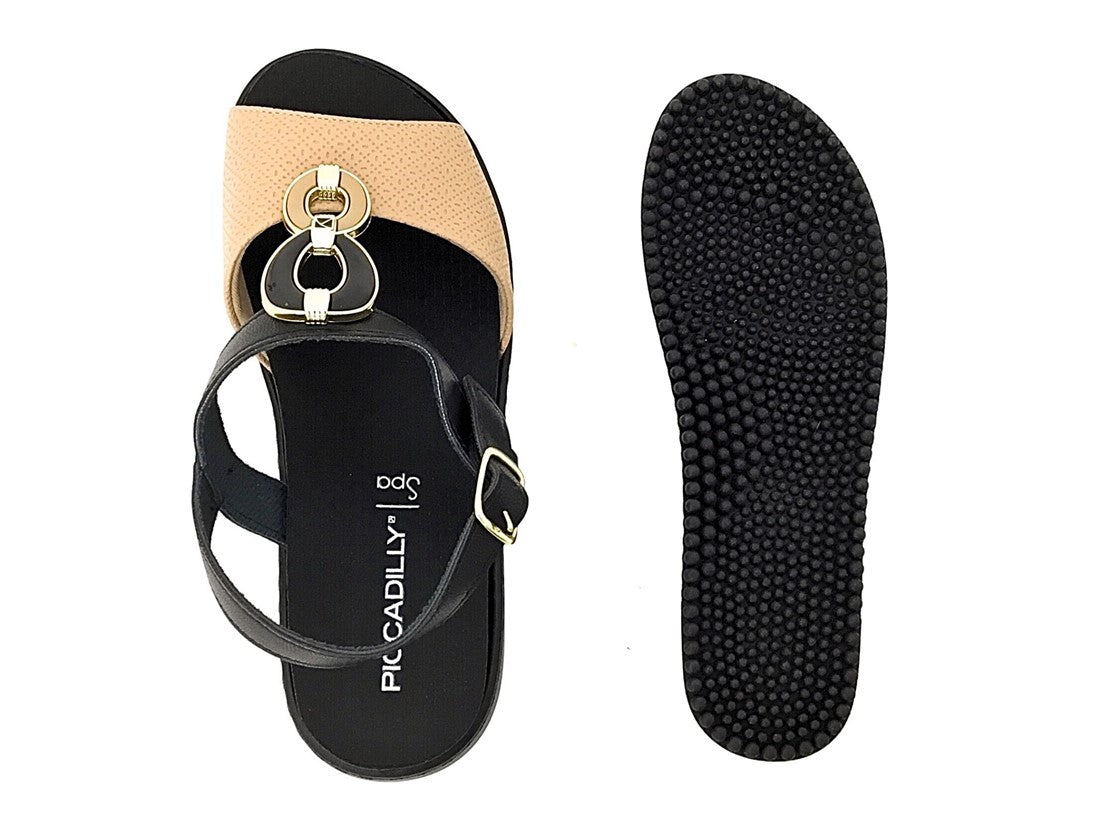 Descubre la elegancia y comodidad de las sandalias cuña para dama de PICCADILLY. Estas sandalias, estilo 568075, están diseñadas con napa stretch que se adapta a tus pies, asegurando un ajuste perfecto con cincho y hebilla. Su detalle metálico las hace únicas, mientras que su plantilla masajeadora proporciona confort en cada paso. Disponibles en tallas del 21 al 30, son ideales para un look casual con un toque sofisticado.