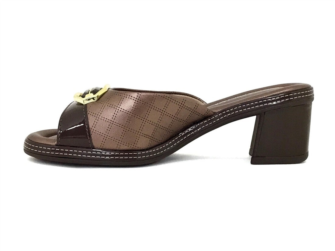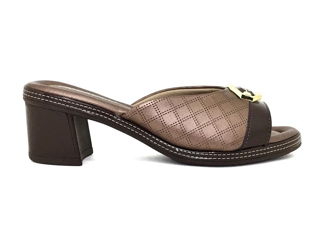 SANDALIA TACON CUADRADO SISTEMA DESTALONADO DISEÑO CON TEXTURAS Y DETALLE DORADO AL FRENTE