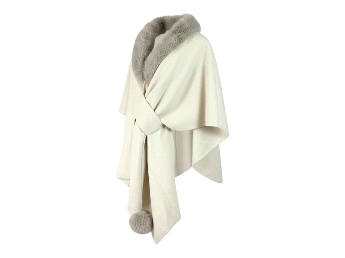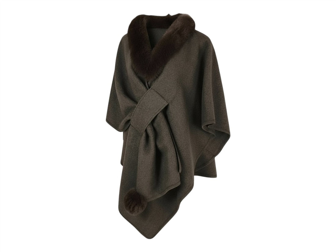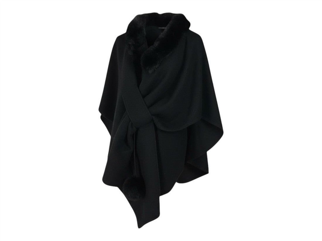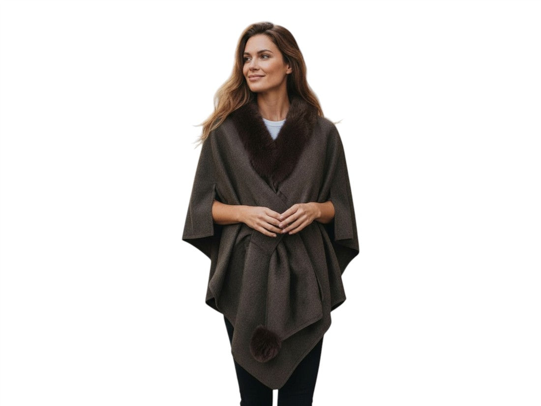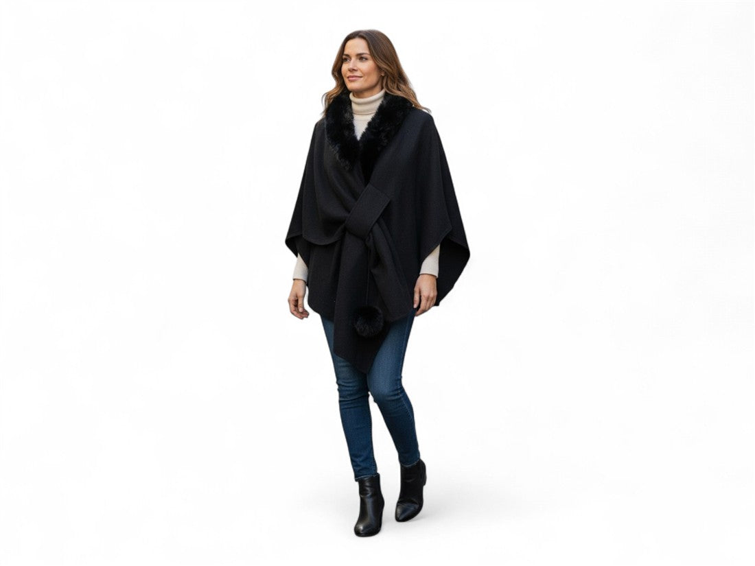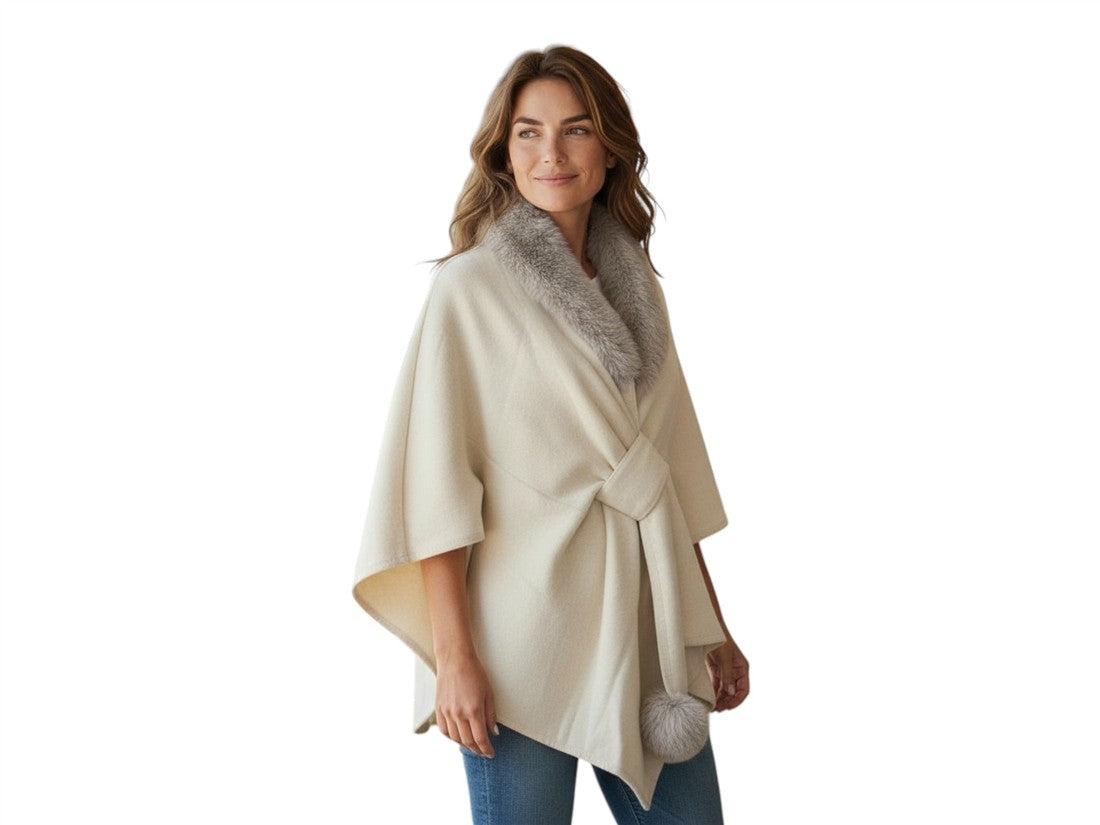 Capa/Poncho de Lana con Cuello de Pelo Sintético, Nudo Frontal y Pompón - Elegancia Versátil