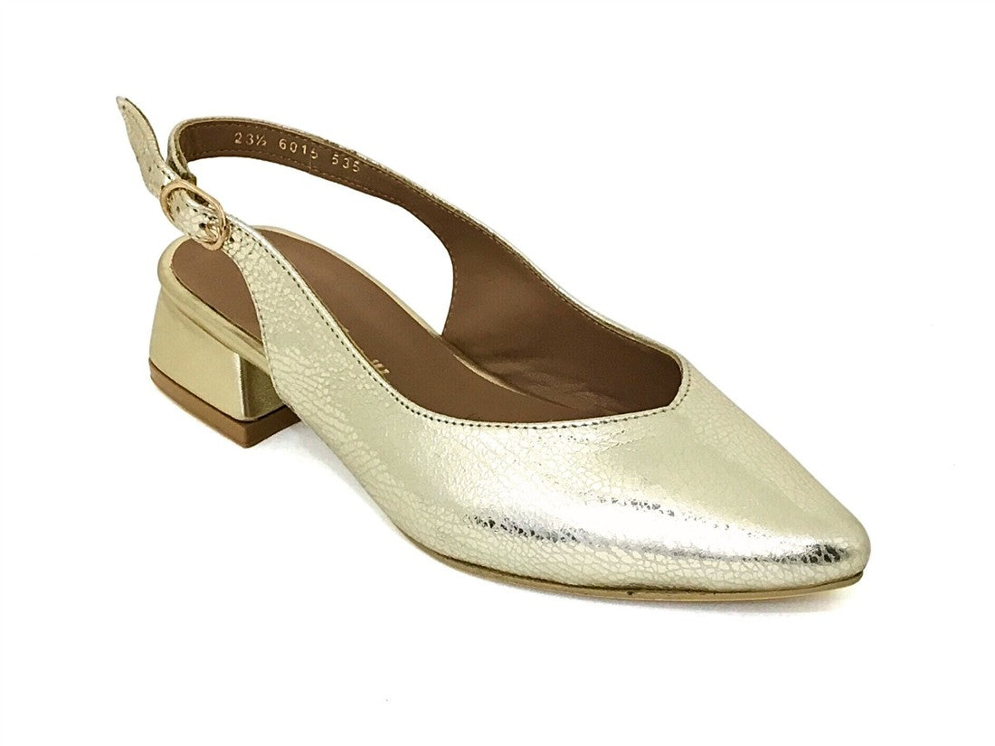 ZAPATO TACON BAJO DESTALONADO AJUSTE CON HEBILLA EN TALON DISEÑO METALICO CON PUNTERA TRIANGULAR
