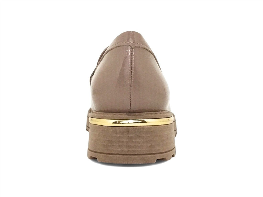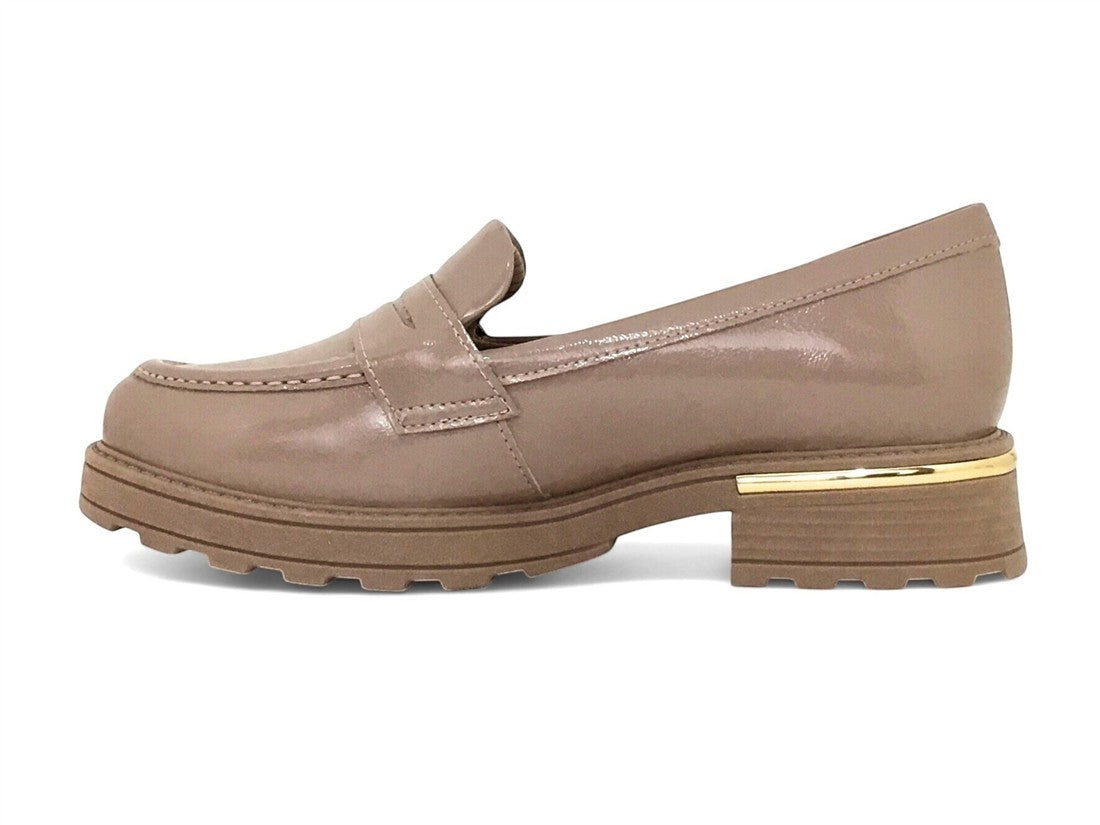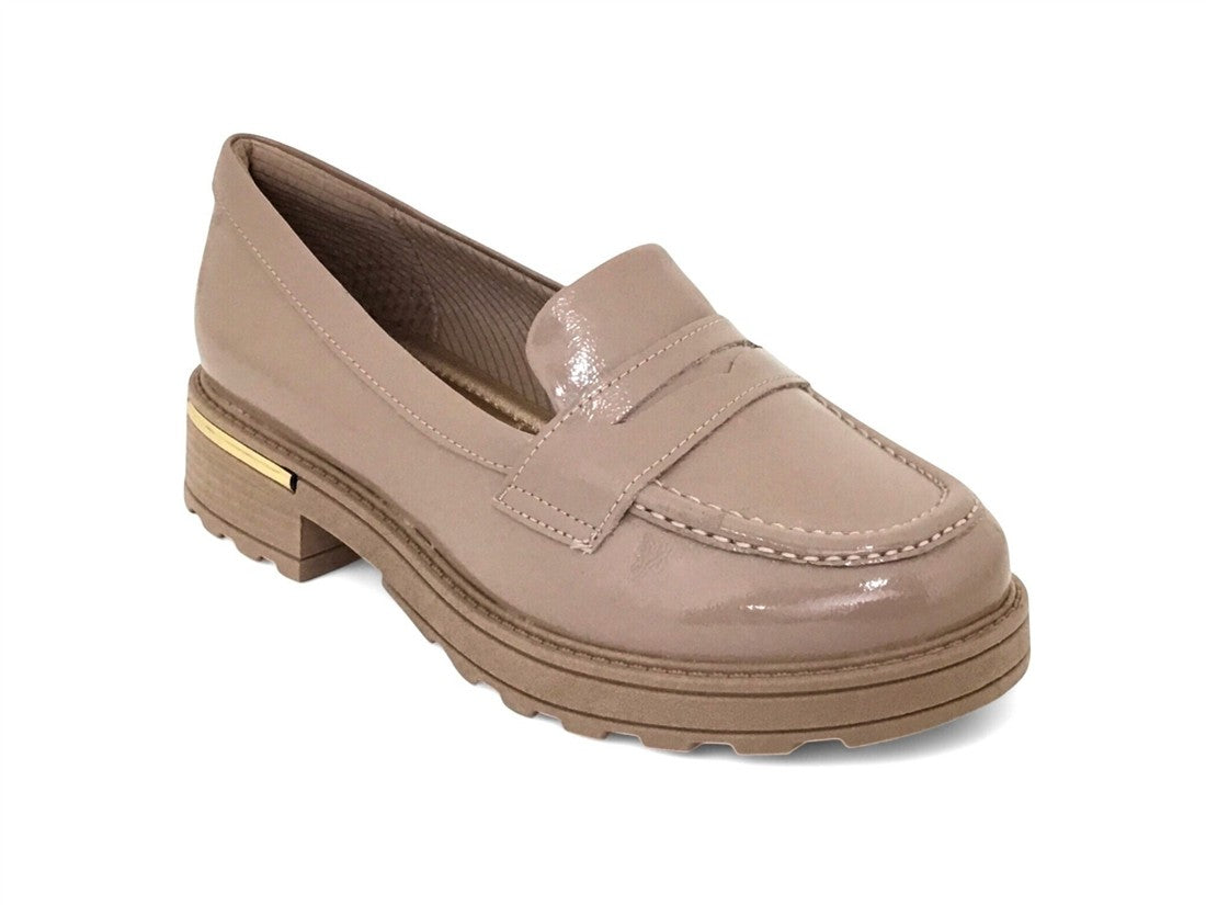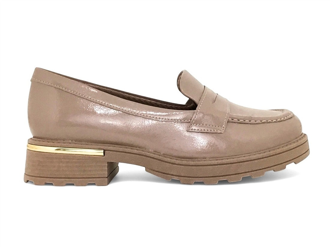 MOCASIN DETALLE DORADO EN TACON CON DISEÑO DE CORTES Y COSTURAS DE SUELA DENTADA