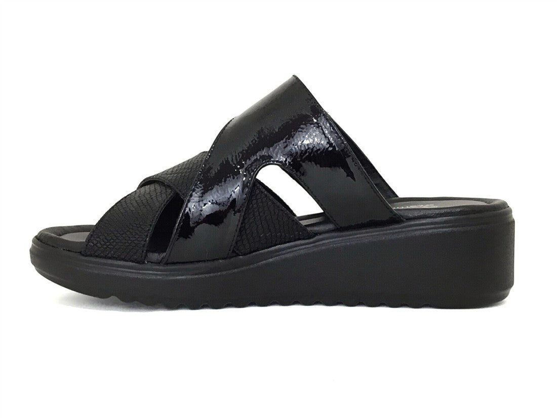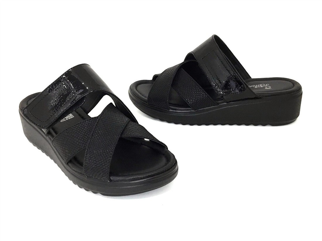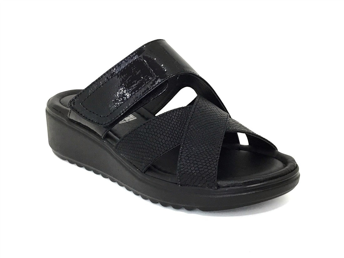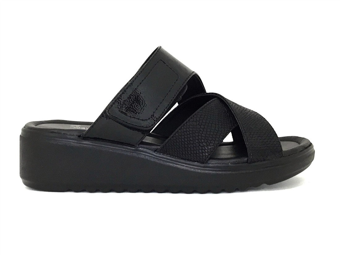SANDALIA CUÑA SISTEMA DESTALONADO AJUSTE CON VELCRO DISEÑO CON TIRAS CRUZADAS Y SUELA TEXTURIZADA